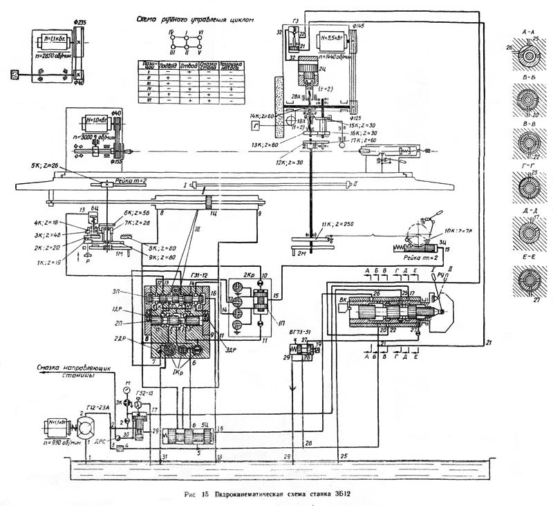 Ввиду простоты кинематических ланцюгів передача руху на исполнительные органы ясна из гідрокінематичної схеми (рис. 15). Подробно робота гідросистемы описана в разделе «Гідрообладнання верстата».