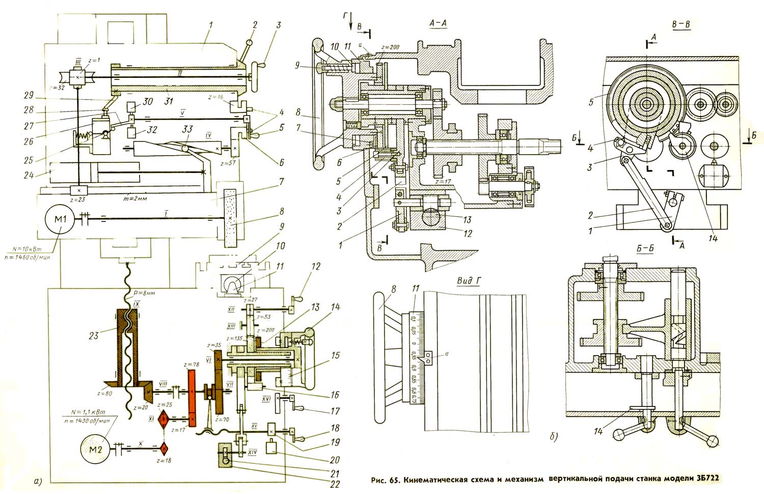 1. Схема кінематична плоскошліфувального верстата 3Б722. Дивитись у збільшеному масштабі