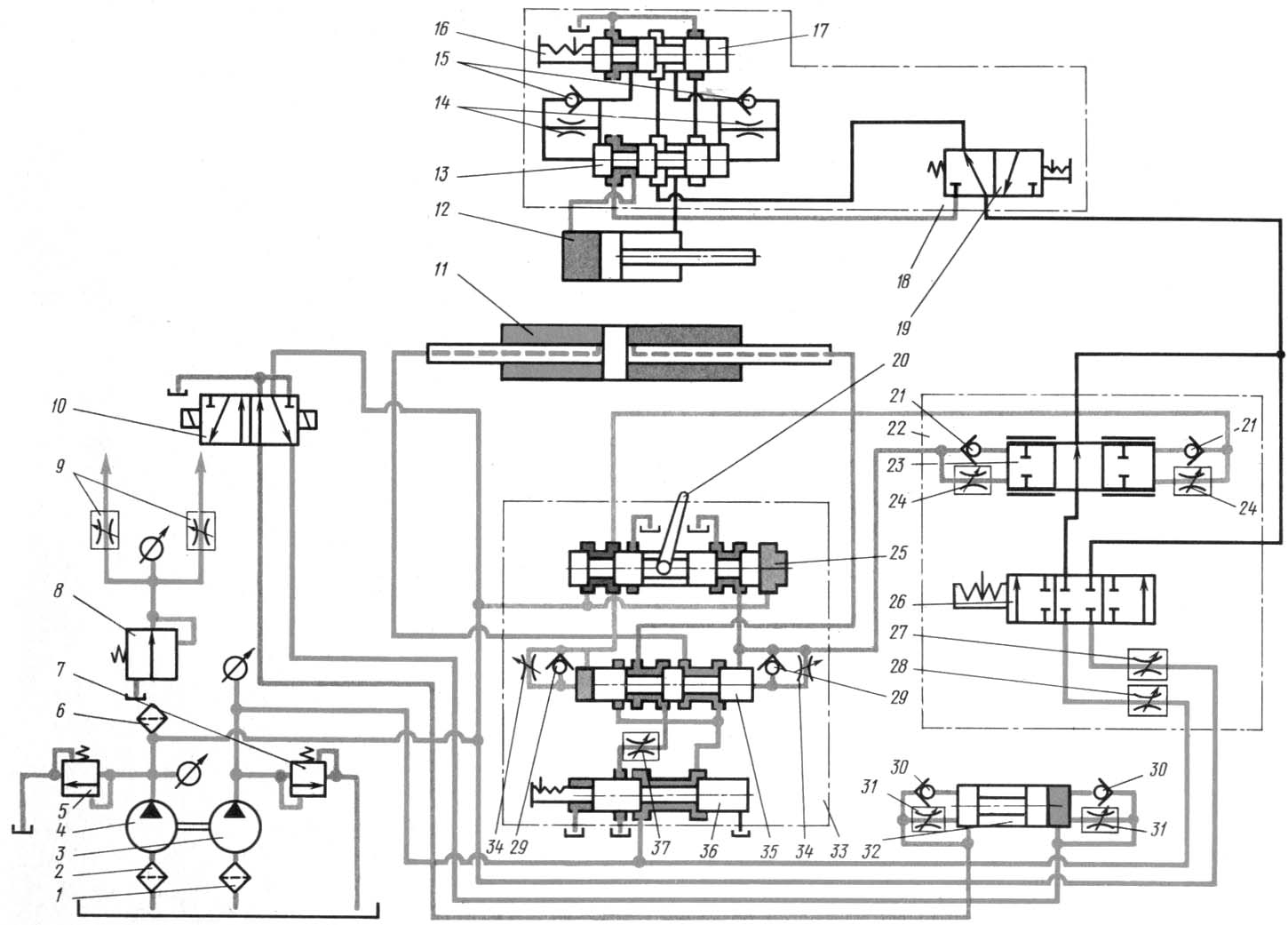 При переміщенні важелем 16 золотника розподільника 17 вправо олію від насоса 4 через розподільники 26, 19, 13, 17 і зворотний клапан 15 потрапляє під лівий торець золотника розподільника 13 і переміщає його в праве положення, направляючи потік масла в поршневу порожнину 2 . рухається праворуч. З штокової порожнини 12 циліндра масло через розподільники 13 і 17 зливається в бак. Дроселі 14 регулюють швидкість переміщення золотника розподільника 13.