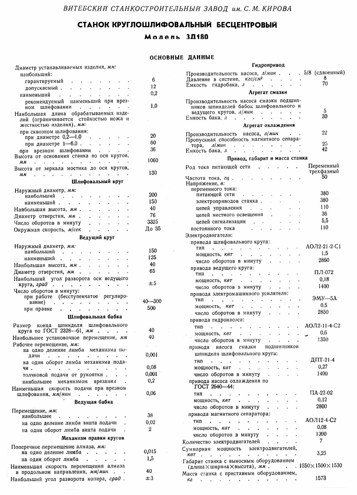 Технічні характеристики круглошліфувального безцентрового верстата 3Д180