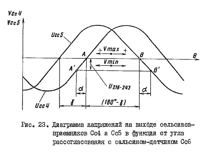 В етом случае точка переворота фазы левого сельсина Cc4 (точка А) должна всегда находиться левее переворота фазы правого сельсина Сс5 (точка В), что обеспечивается з помощью специальных ограничителей, установленных на валах сельсинов-приемников.