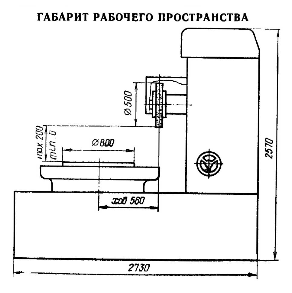 Габарит робочого простору шліфувального верстата 3Д741. Дивитись у збільшеному масштабі