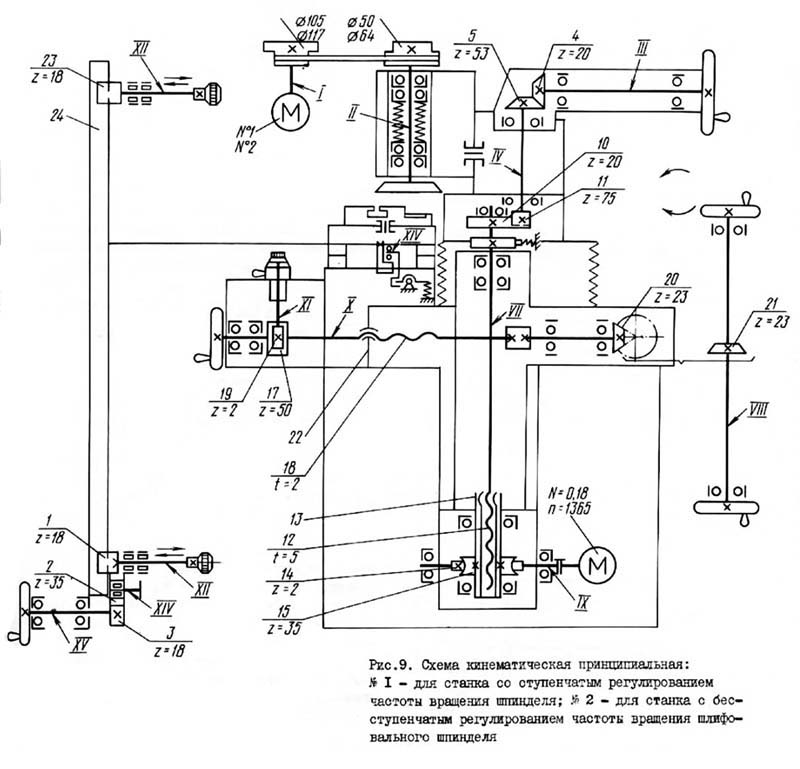 1. Схема кінематична заточного верстата 3Е642. Дивитись у збільшеному масштабі