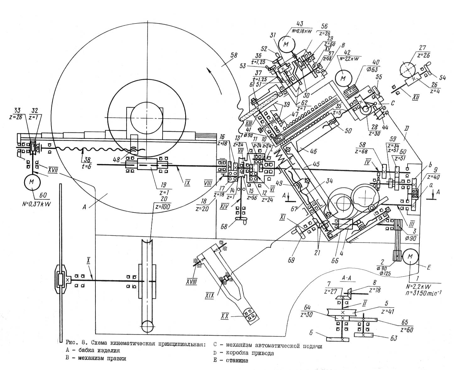 Это рух осуществляется следующим образом: от електродвигуна I через клиноременную передачу (шкивы) 2, 3, червячную передачу 4, 5 на распределительный вал II. На распределительном валу II находится кулак 6, который через двуплечий рычаг 45 приводит в возвратно-поступательное рух ползун 46, который через винт-гайку 50 соединен з механізмом автоматичною подачі шлифовальной головки.
