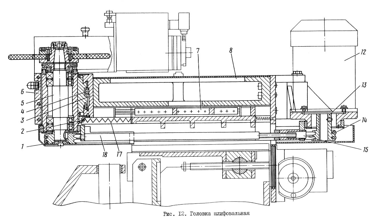 Головка шлифовальная (см.рис.1) установлена в наклонных направляючих качения сверху корпуса салазок приводу і включает в себя шлифовальный шпиндель 5 і корпус 8 шлифовальной головки з електродвигуном 12.