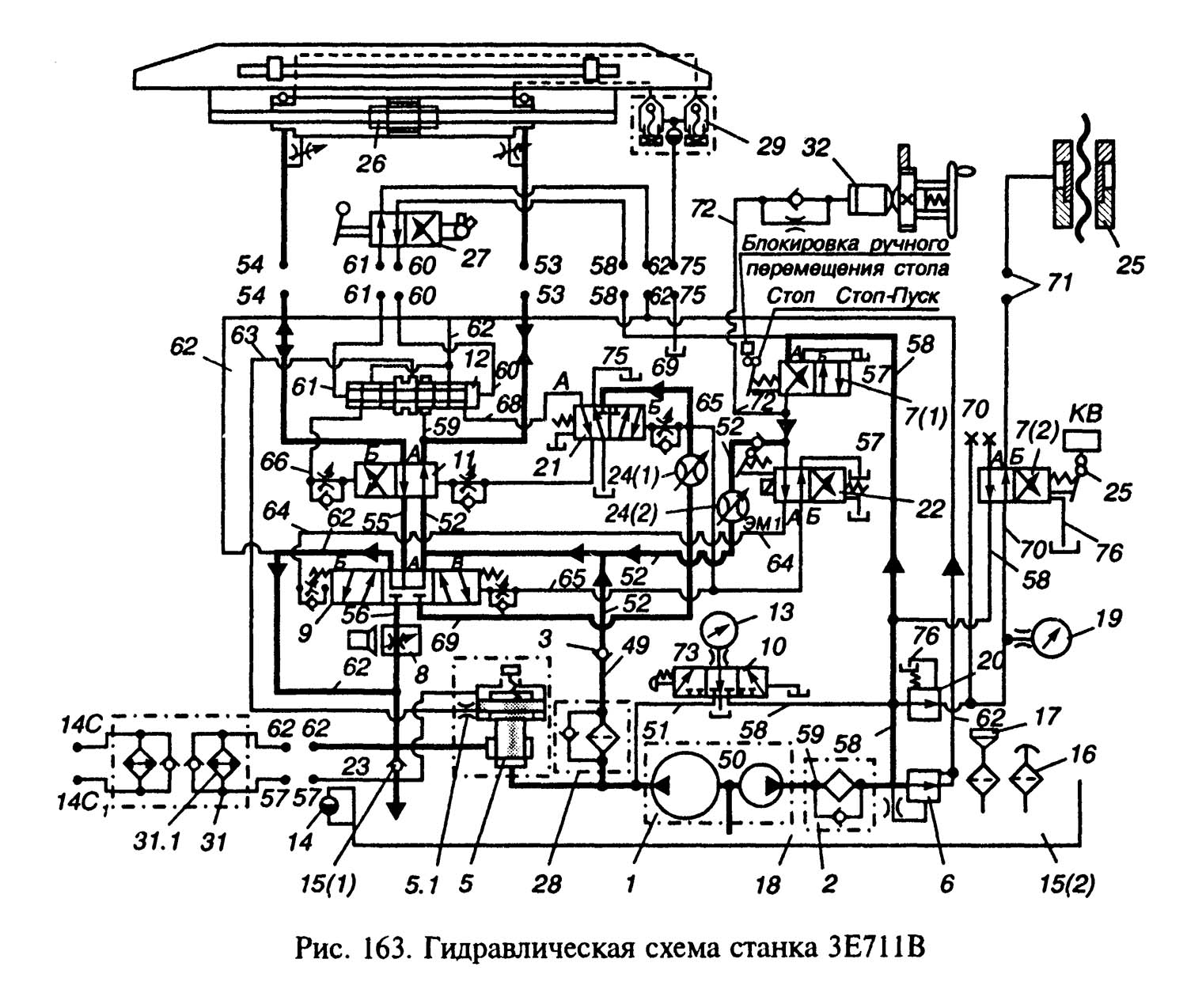 При остановке стола краном 7 /1/ масло сливается в бак по ланцюги 1-51-28-49-3-52-9-62-25-57. При положении А гідрораспределителей 9 і 11 полости гідроцилиндра 26 і магистраль 62 соединены по ланцюги 53-11-52-9-55-62-11-54. Распределитель 12 объединяет магистрали 54 і 53. В результате етого перепад давления на клапане 23 действует на клапан 5 і поднимает післядний: мало от насоса 1 большой производительности дополнительно сливается через клапан 5. Пристрій 29 служит для выпуска воздуха из гідроцилиндра 26. При з'єднанні к гідросистеме теплообменников 31 слив масла осуществляется по ланцюги 62-31(1)-57-14.