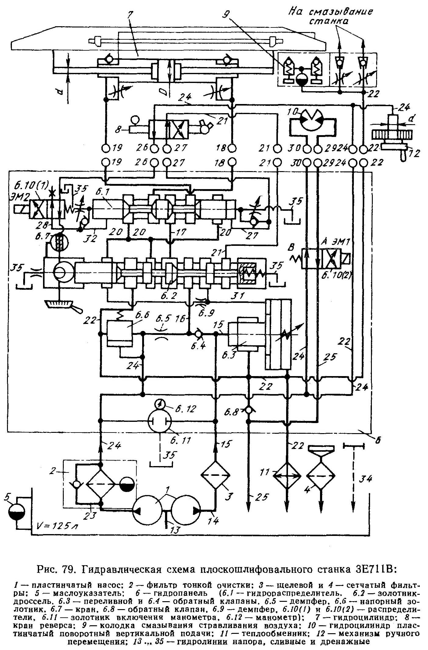 1. Схема гідравлічна плоскошлифовального верстата 3Е711В. Дивитись у збільшеному масштабі