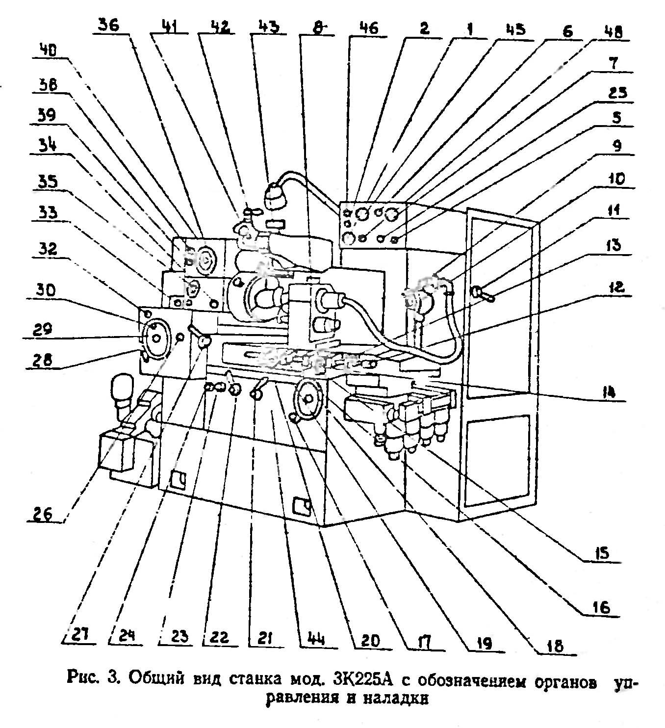 Розташування органів керування верстатом 3К225. Дивитись у збільшеному масштабі