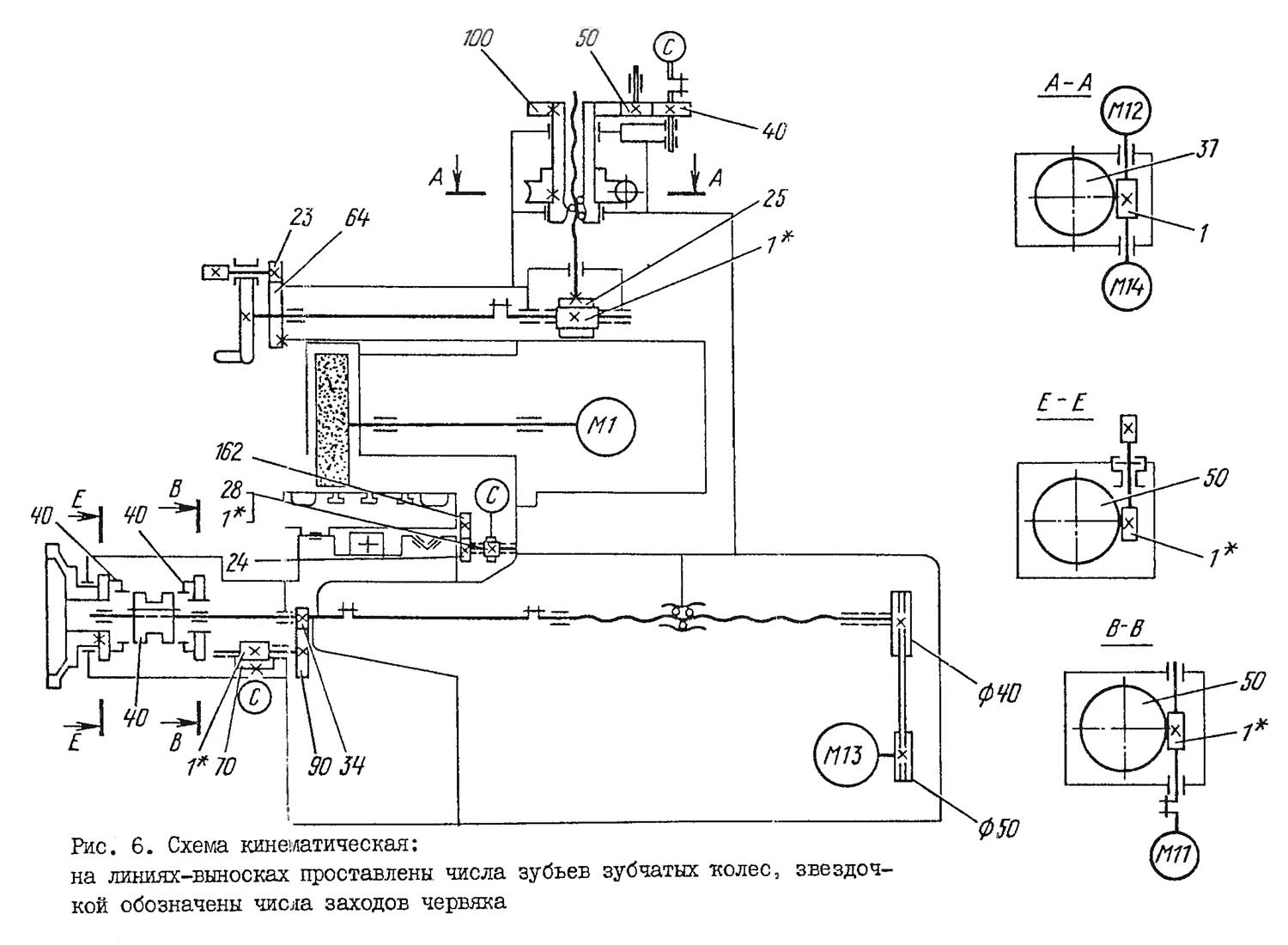 Кінематична схема плоскошліфувального верстата 3Л722В. Дивитись у збільшеному масштабі