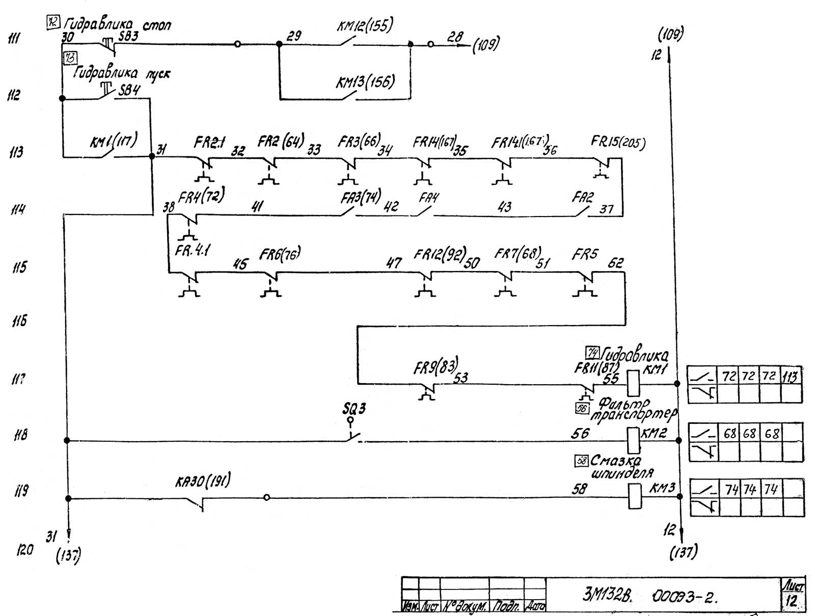 Нажмите кнопку SB4 (гідравлика пуск), от которой через KM1 включаются електродвигатели М4...М6, М7 (при нажатом SQ3), M8...М11.