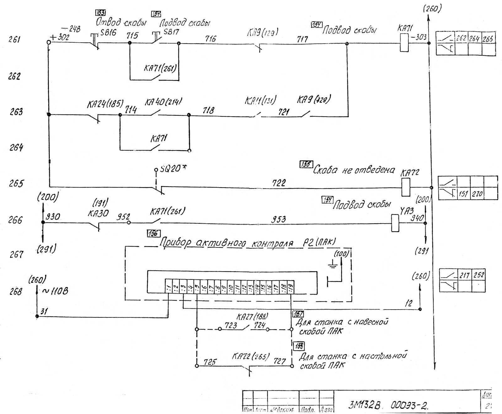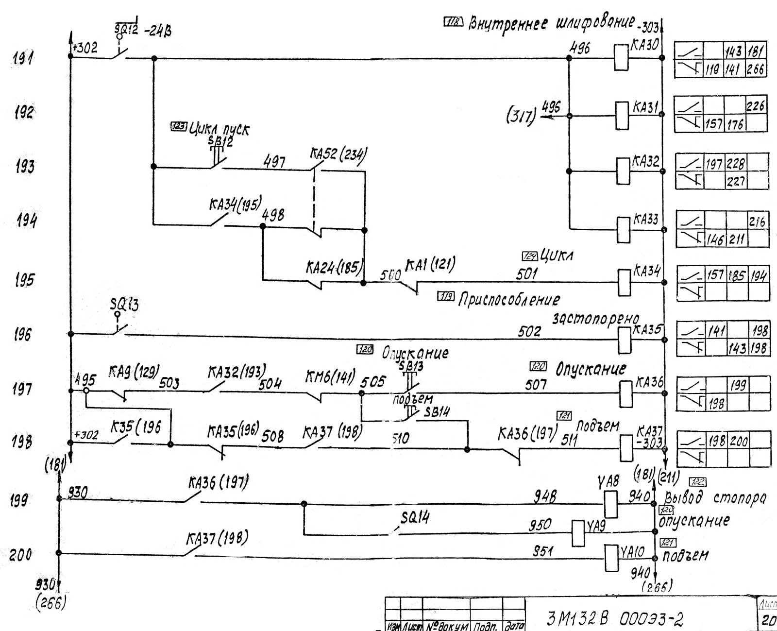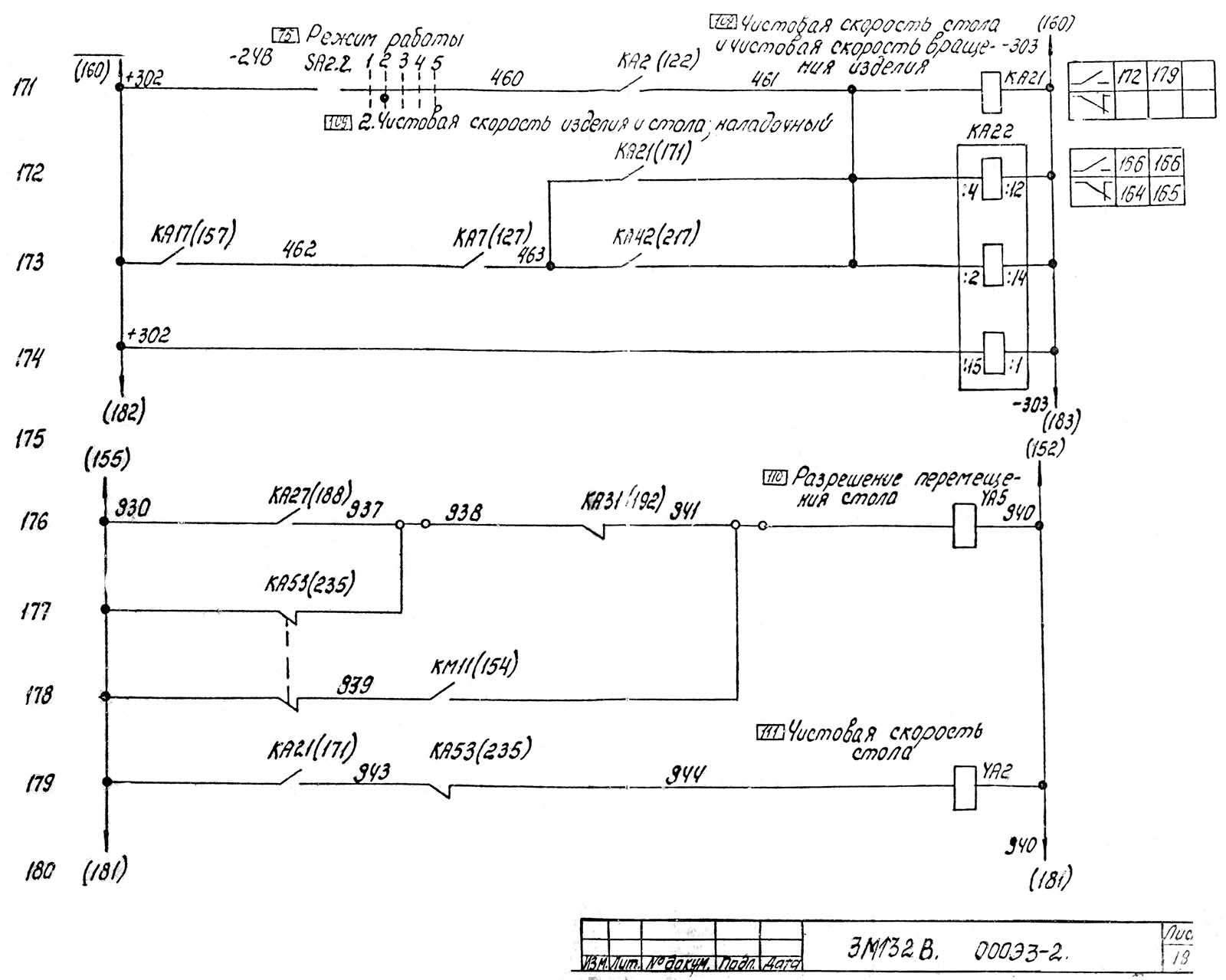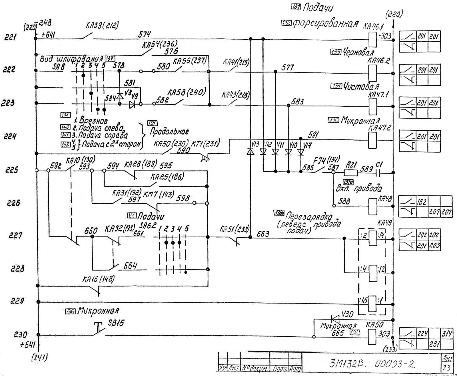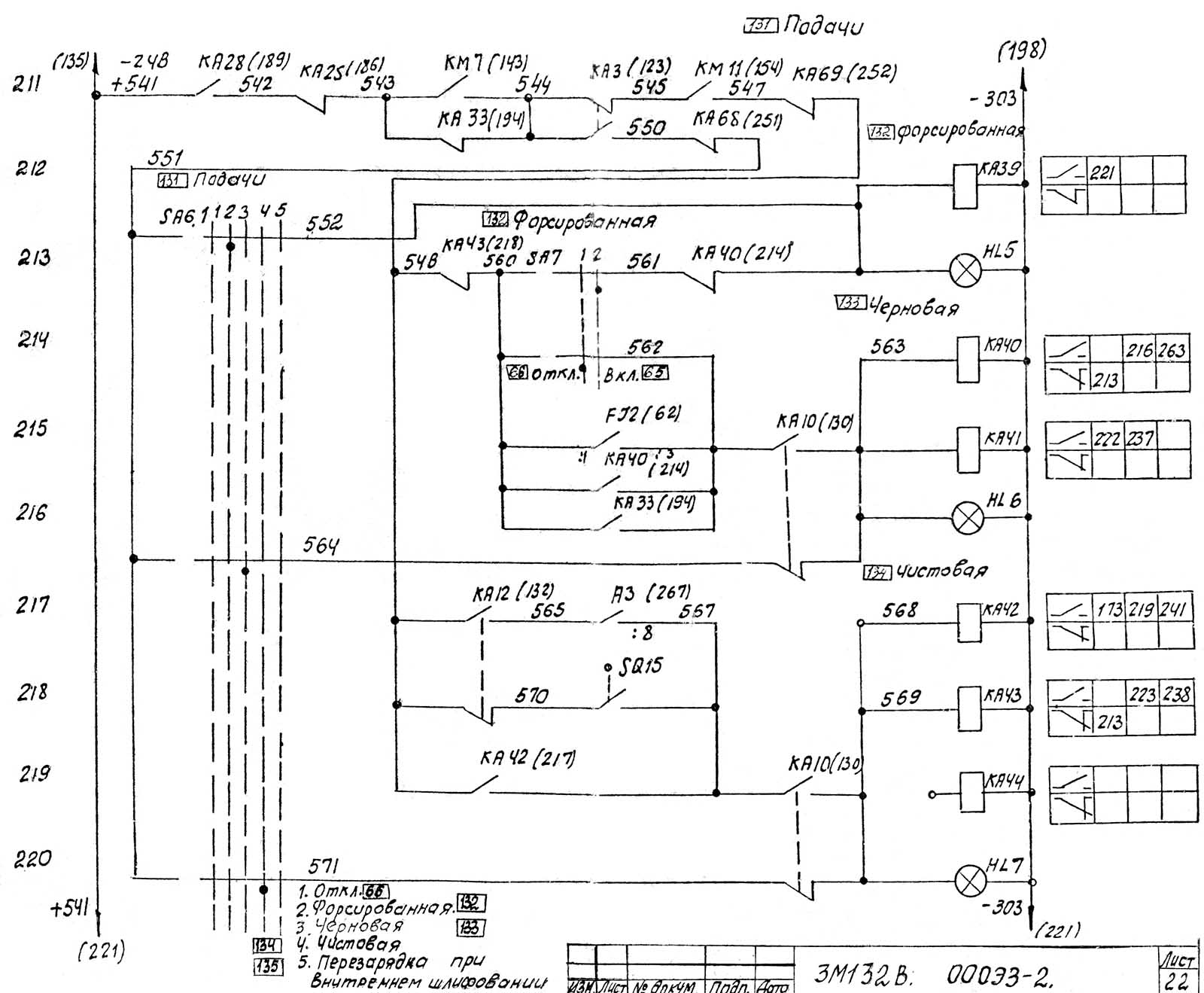 При нажатии SQ15 включается чистовая подача, лампа HL7 і идет со скоростью, определяемой регулятором R19 до тех пор, пока не нажмется SQ19 - подача прекращается, U2 і HL7 отключаются, происходит выхаживания по часу, определяемому КТ3. После окончания выдержки часу і отключения кнопкой SВ7 шлифовального круга, приспособления включается привід U2 і происходит перезарядка, - бабка перемещается назад со скоростью форсированной подачі, определяемой R11 до тех пор, пока не нажмется SQ16. На етом цикл врезного шлифования отверстия закончен;