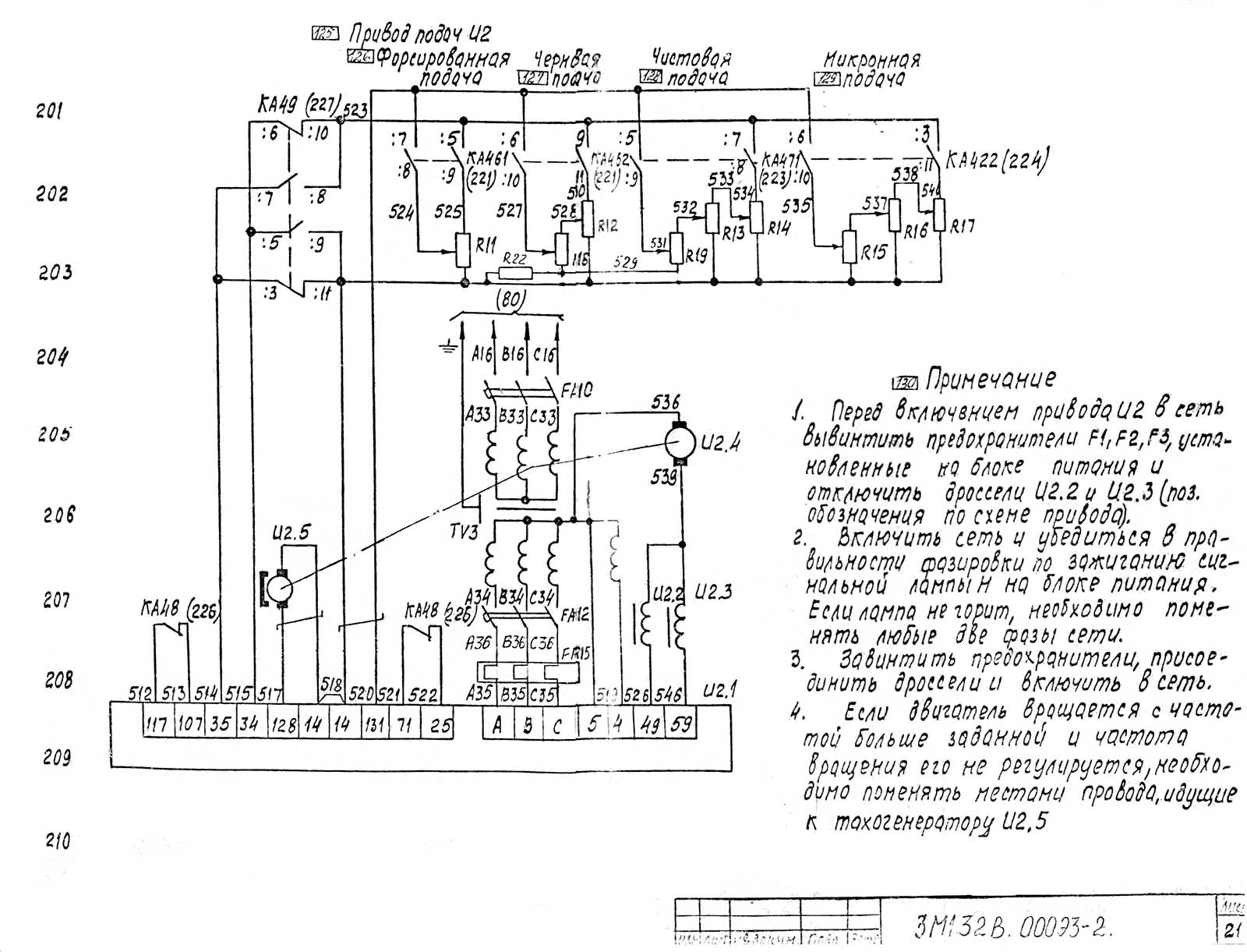 Одновременно включаете насос охлаждения М2 і привід подач U2, происходит черновая подача со скоростью, определяемой регулятором R18, при етом включается HL6, до тех пор пока не нажмется SQ15.