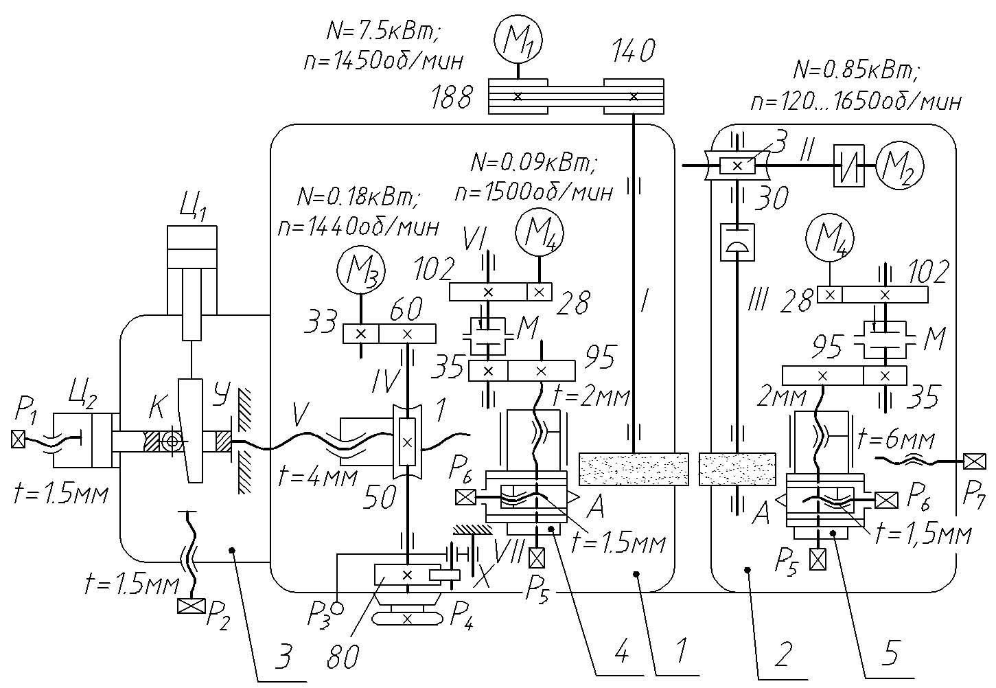 Главное движение – вращение шлифовального круга – производится от електродвигуна М1 (7,5 кВт; 1450 об/мин) через клиноременную передачу 188/140 (рис. 3). Вращение ведущего круга осуществляется через червячную передачу 3/30 от електродвигуна М2 (0,85 кВт; 120–1650 об/мин, регулювання бесступенчатое).
