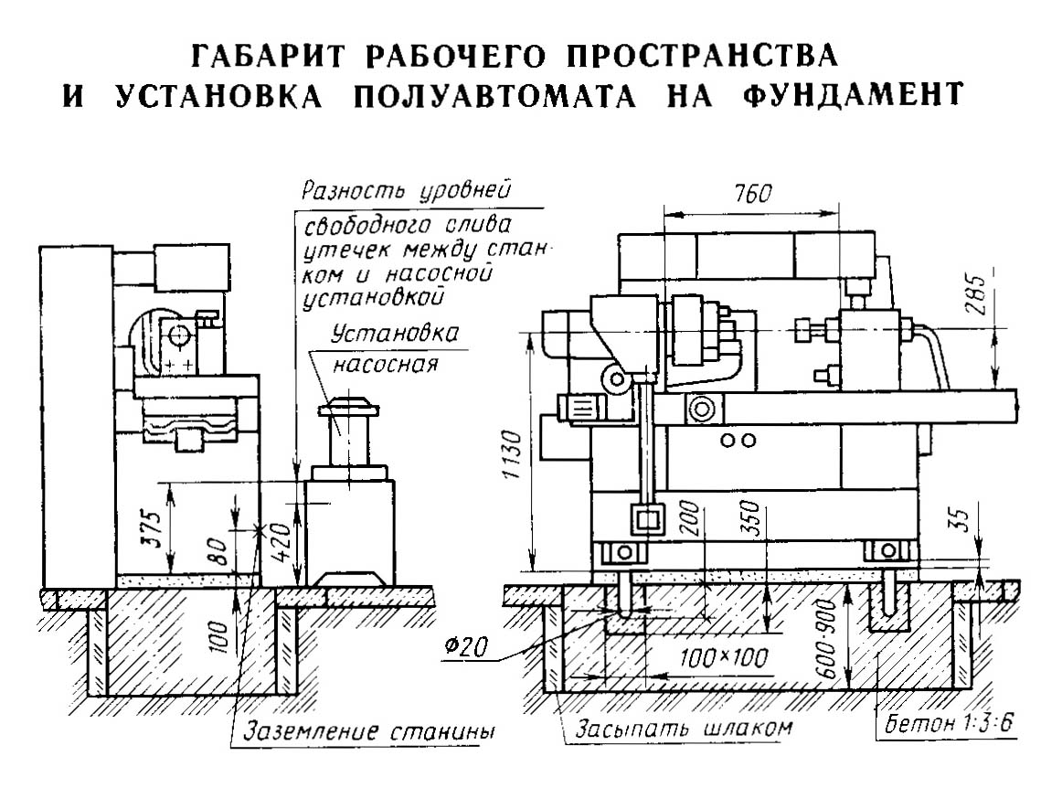 Габаритні розміри робочого простору верстата 3М225. Дивитись у збільшеному масштабі