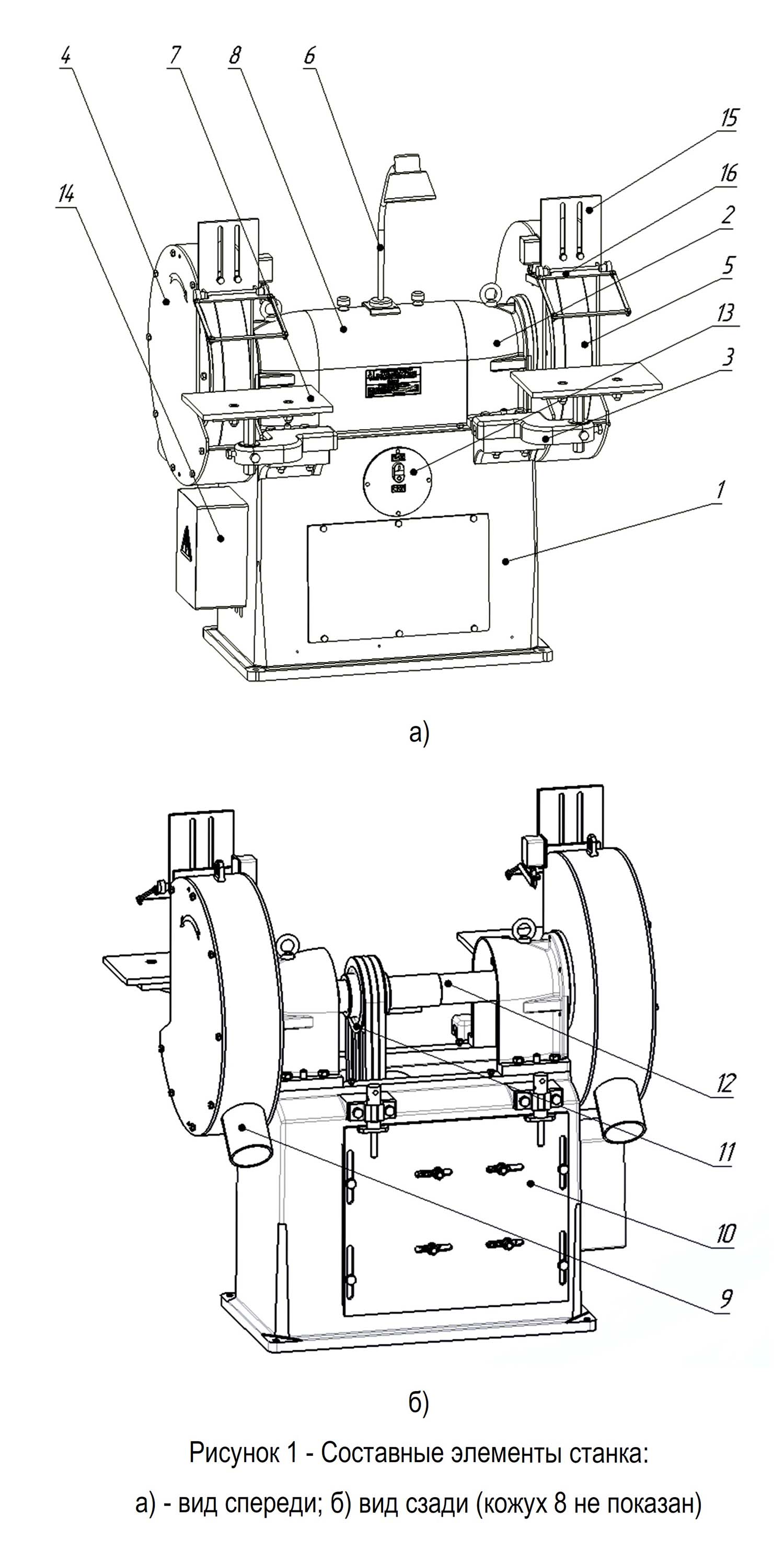 На верхній частинині корпусу 1 Верстата встановлені корпуси 2 підшипників і захисний кожух 8 з ручками. Підшипники є опорами для валу 12, на якому встановлений приводний шків 11. Шків 11 має можливість осьового переміщення вздовж приводного валу 12 Верстата. Обертання шківу 11 передається клиновими ременями від електродвигуна, розташованого всередині корпусу 1 і закріпленого на плиті 10.