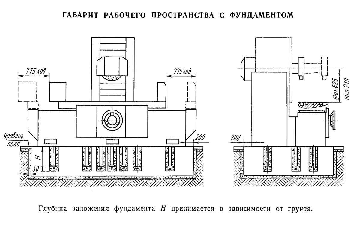 Габаритні розміри робочого простору верстата 3П722. Дивитись у збільшеному масштабі