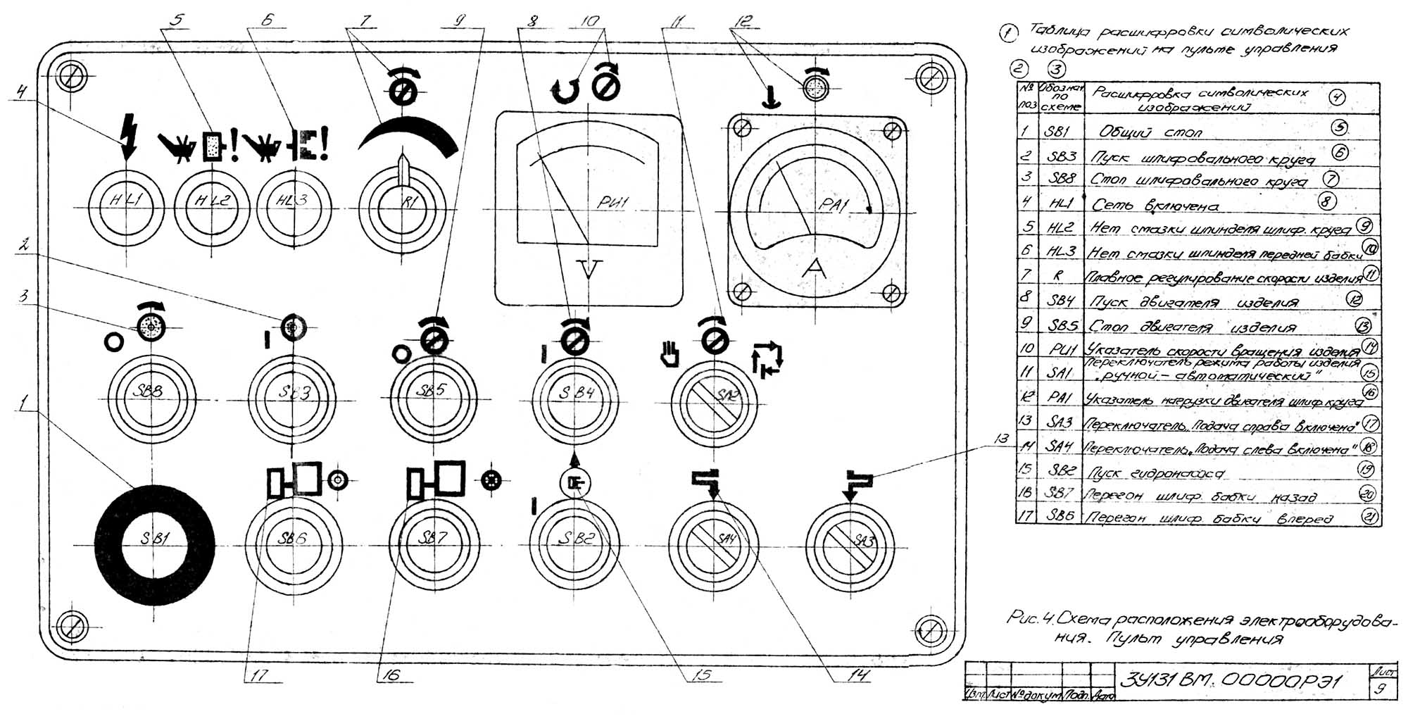 Розташування органів керування на пульті шлифовального верстата 3У131