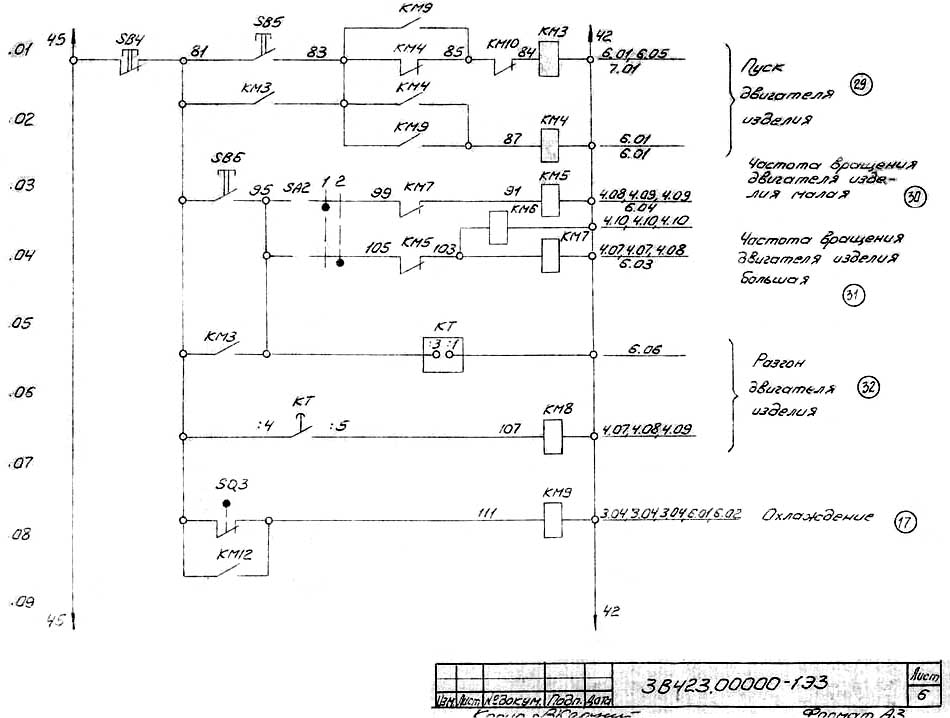 Пуск і зупинка електродвигуна М7 (изделие) происходит при нажатии кнопок SB5 і SB4 соответственно. Плавный пуск отключает резкие толчкипри разгоне двигуна, что обеспечивается включением в каждую фазу двигуна М7 резисторов R1, R2, R3 на время установки реле КТ.