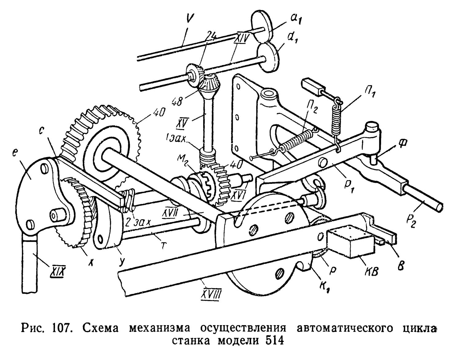 При вращении кулачка криволинейный участок его профиля, выполненный по спирали, отжимает ролик r1 вправо і перемещает винт XIV (без обертання) в продольном направлении. Винт ввинчен в гайку зубчатого колеса 15, закрепленного в суппорте; при перемещении гвинта супорт з долбяком придвигаются к заготовке.