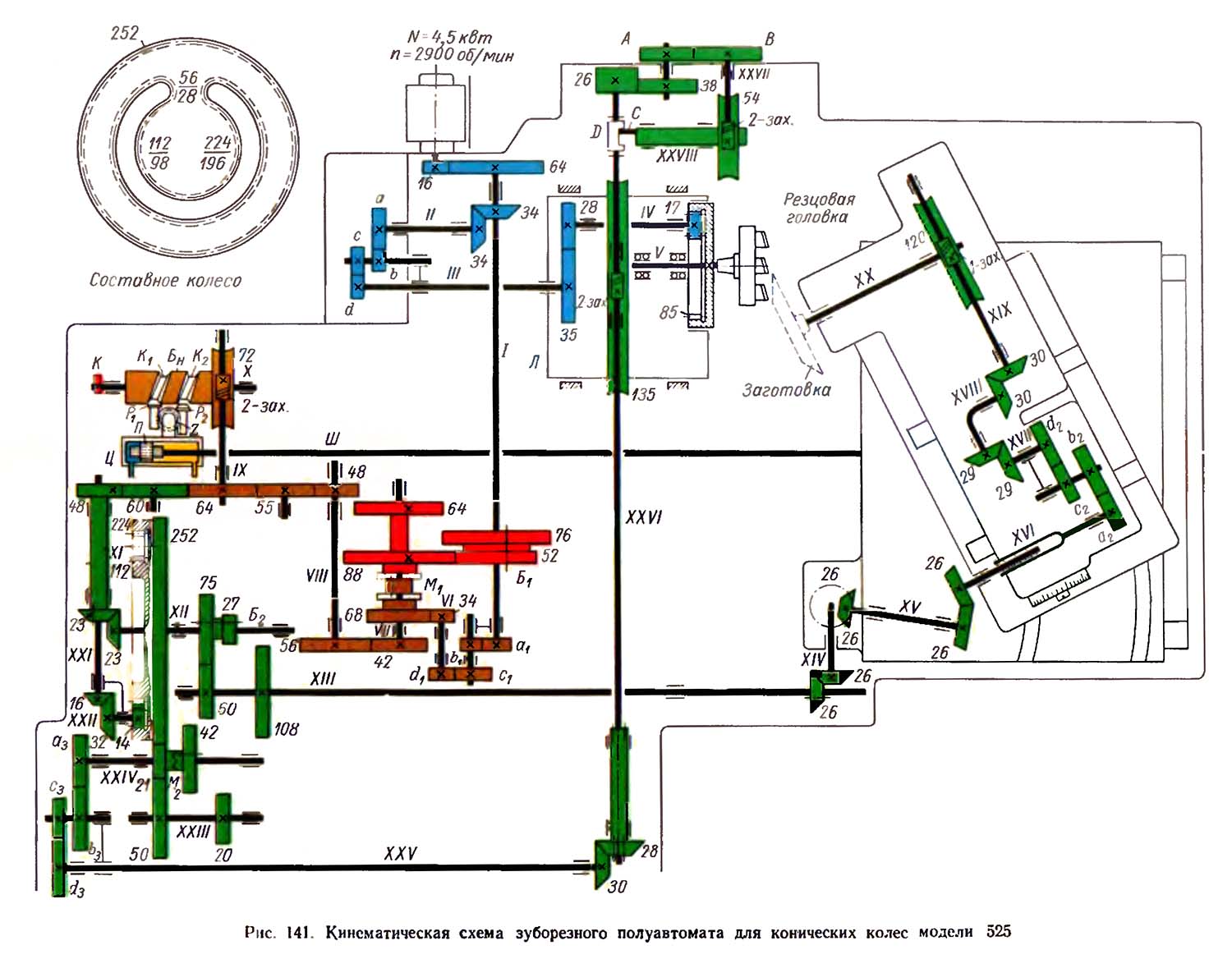 2. Кінематична схема зуборезного верстата 525. Дивитись у збільшеному масштабі