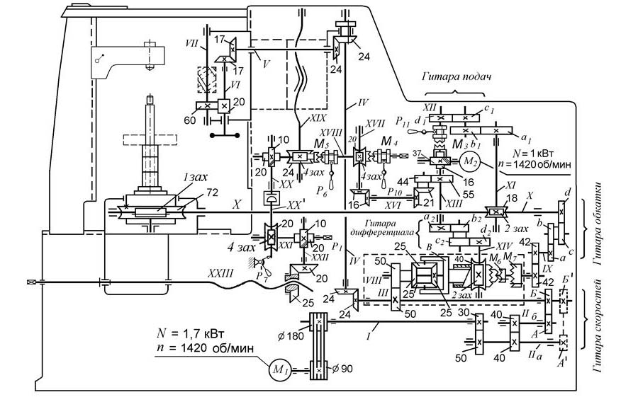 Отсюда вращение передаётся через сменные зубчасті колёса А` і Б` или через механізм реверса 40/40 і сменные зубчасті колёса А і Б на вал III[2]. С вала III через расположенные на валах IV, V і VI три конические зубчасті передачи 24/24 (две передачи) і 17/17 з общим передаточным отношением равным 1, вращение передаётся на вал VI.