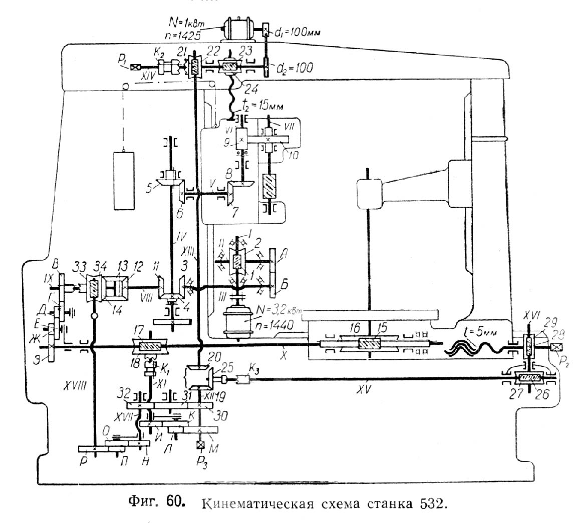 От електродвигуна (фиг. 60) мощностью в N = 3,2 кВт з числом оборотів п = 1440 об/мин через упругую муфту получает вращение червяк 1. Червячное колесо 2 закреплено на валу II. На свободном консольном кінці вала II сидит сменная шестерня А, сцепляющаяся со сменной шестерней Б, сидящей на валу III. Далее рух передається коническим колесам 3, 4 і вертикальному валу IV. Коническое колесо 5 смонтировано в салазках суппорта і связано скользящей шпонкой з валом IV. При вращении вала IV через конические колеса 5, 6, 7 і 8 і цилиндрические колеса 9 і 10 приводится во вращение фрезерный шпиндель VII. Меняя сменные колеса швидкостей А і Б, можно настраивать шпиндель на различные значения числа оборотів в минуту.