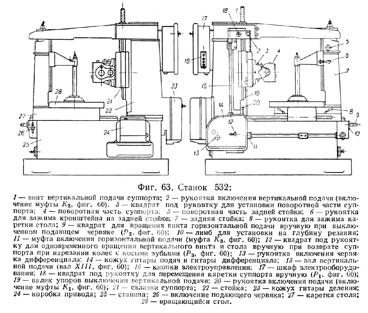 12. квадрат под рукоятку для одновременного обертання вертикального гвинта і стола вручную при возврате суппорта при нарезании колес з косыми зубьями (Р3, фиг. 60);