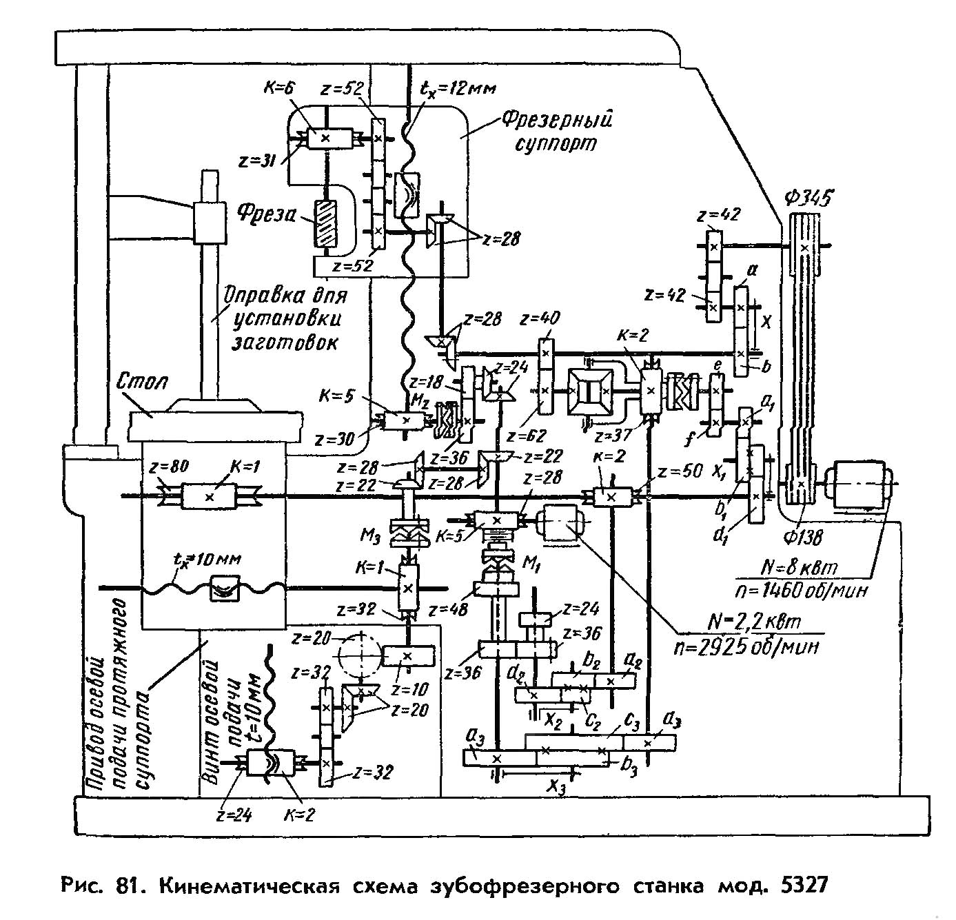 Схема кінематична зубофрезерного верстата 5327. Дивитись у збільшеному масштабі