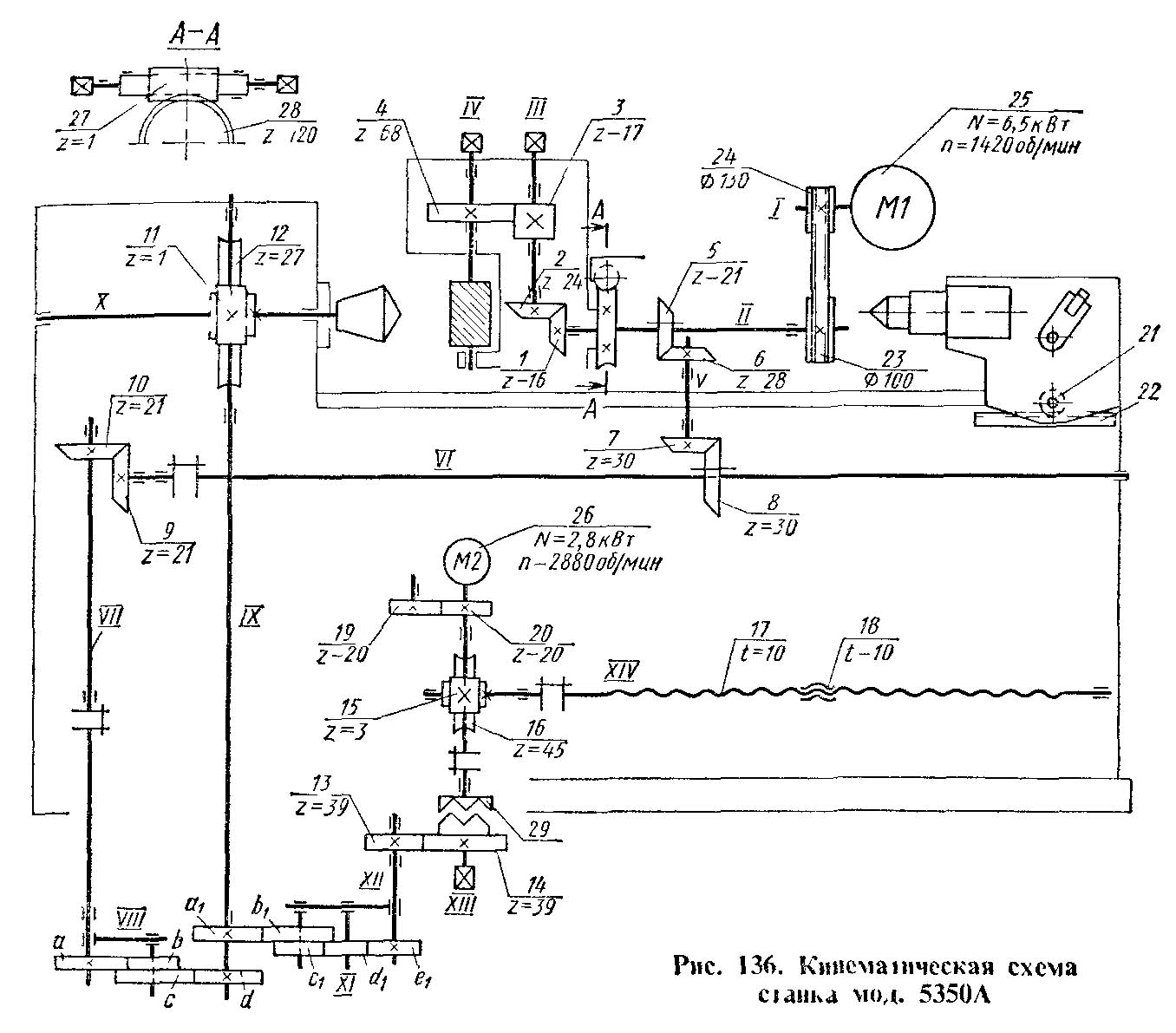 Ланцюг головного руху - електродвигатель 25, клиноременная передача со сменными шкивами 24 і 23 і передачи 1—2, 3—4. Ланцюг деления связывает фрезерный шпиндель IV со шпинделем вироби X передачами 4—3, 2—1, 5—6, 7—8, 9—10, сменными колесами гітари деления а—b і с—d і червячной передачей 11—12. Ланцюг подач (связывает шпиндель вироби з винтовой парой 17-18) - червячная передача 12-11, сменные колеса подач a1-b1 і с1 -d1, цилиндрическая передача 13-14 і червячная пара 15—16. Быстрое вращение ходовой винт получает от електродвигуна 26 швидкого ходу через червячную передачу 15 — 16 при выключенной муфте 29. Вручную ходовой винт вращают через передачу 19-20 і 15—6. В процессе фрезерування детали сообщается только вращательное рух обката, осевая подача на станке осуществляется поступательным движением вращающегося инструмента.