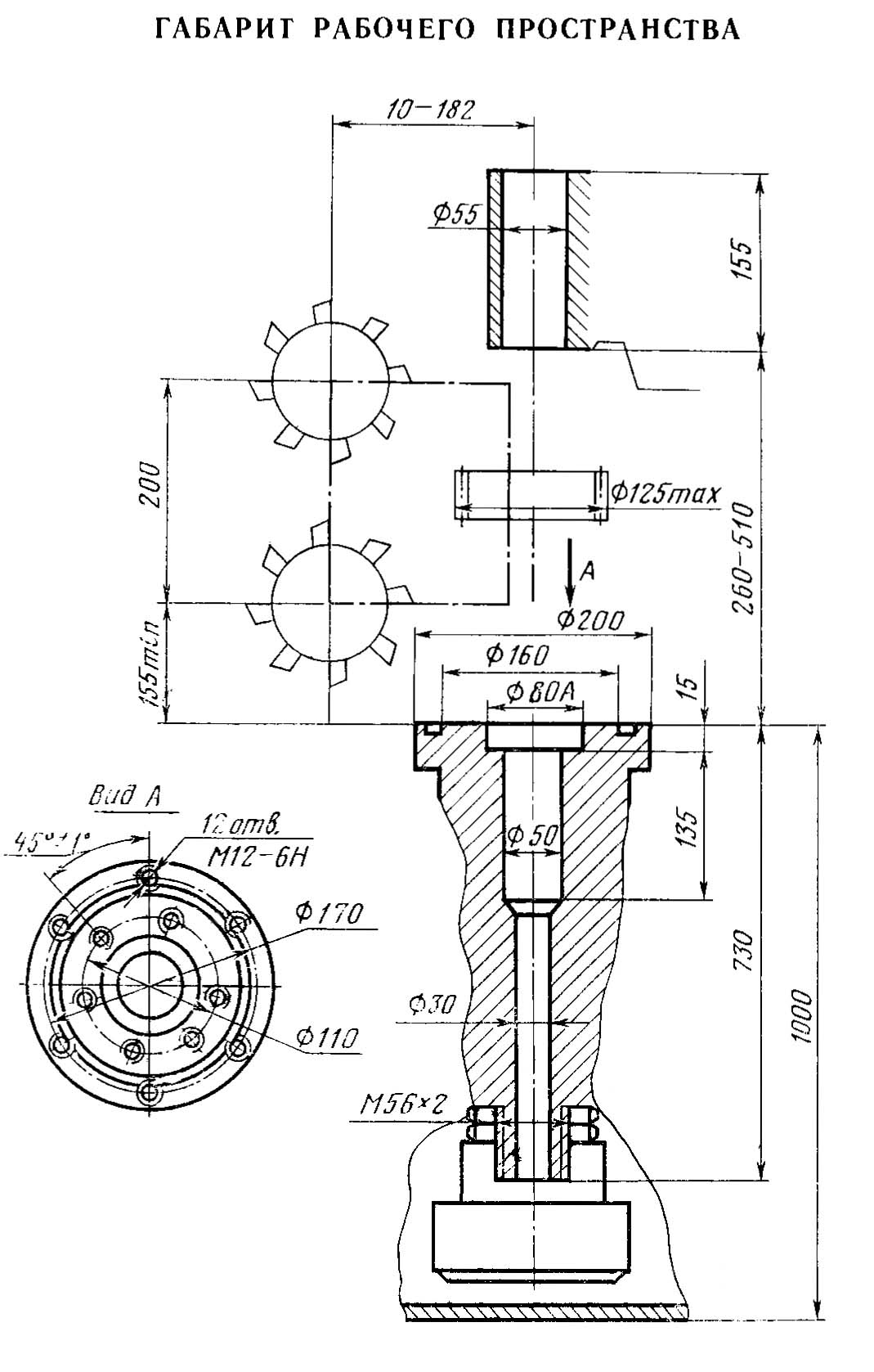 Габарити робочого простору зубофрезерного напівавтомату 53А13
