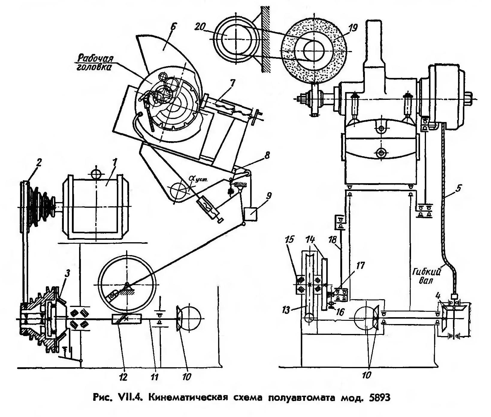 Кінематична схема верстата (рис. VII.4). От електродвигуна 1 (N = 1 кВт, n = 930 об/мин) через клиноременную передачу 2 з четырехступенчатыми шкивами і фрикционную конусную муфту 3 вращение передається червячному валу 11, з которого рух сообщается ланцюги качания рабочей головки (бабки вироби) і ланцюги деления.