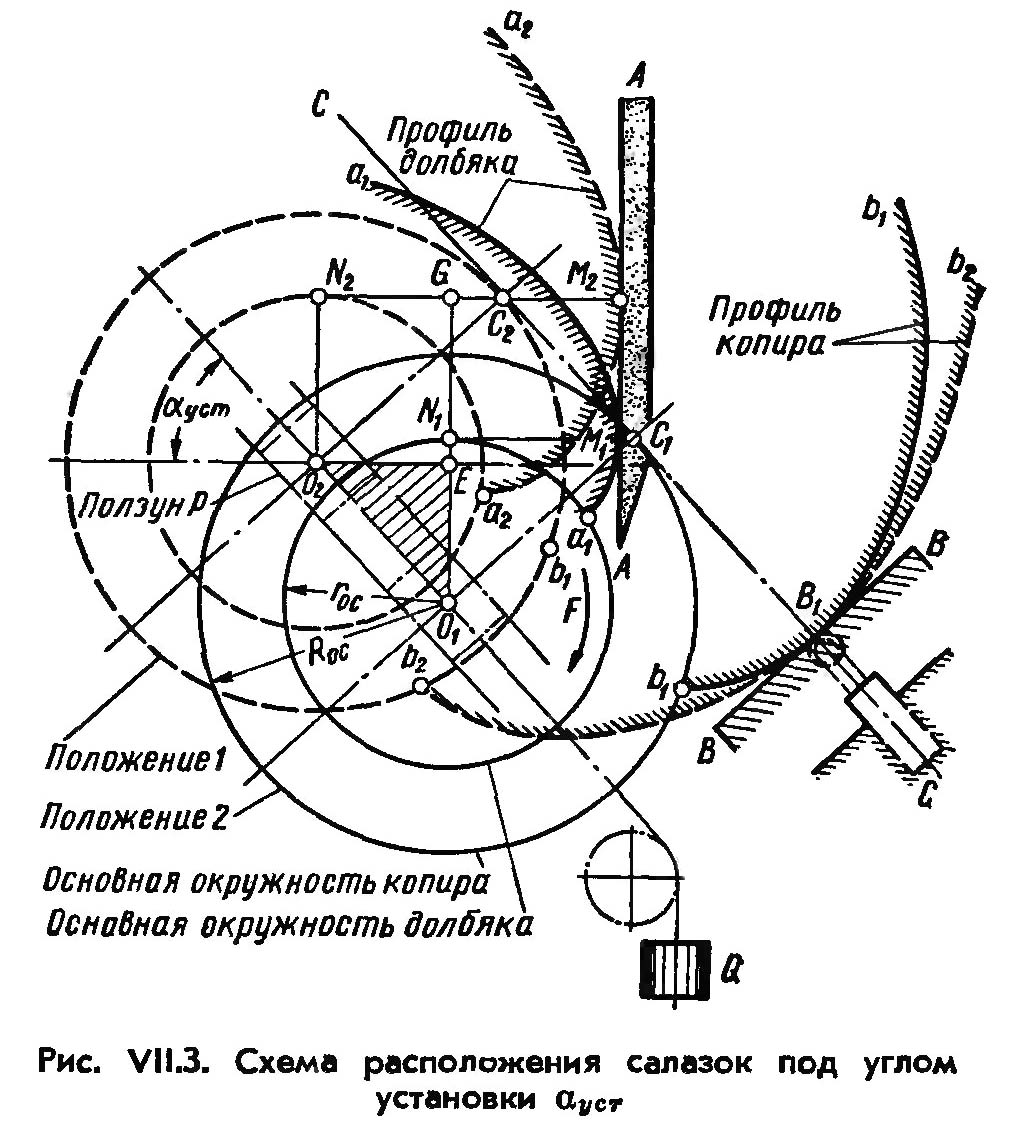 На практике схема переміщення салазок параллельно производящей прямой не применяется, так как шлифовальный круг работал бы при етом только одной окружностью, которая описывается точкой А, і круг быстро изнашивался бы, а ето привело бы к понижению точності отшлифованного профиля зуба долбяка. Кроме того, при такой схеме основні окружности копира і шлифуемого долбяка должны точно совпадать. Следовательно, для каждого диаметра начальной окружности долбяка (основная окружность копира является для долбяка как бы начальной окружностью) необходимо было бы изготовлять отдельный копир. Для устранения етих недостатков предусмотрена возможность установки салазок вместе з производящей прямой под углом α уст к оси шпинделя шлифовального круга (рис. VII.3).