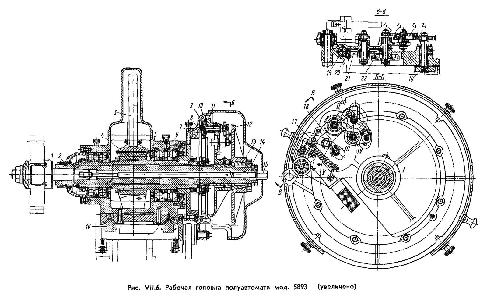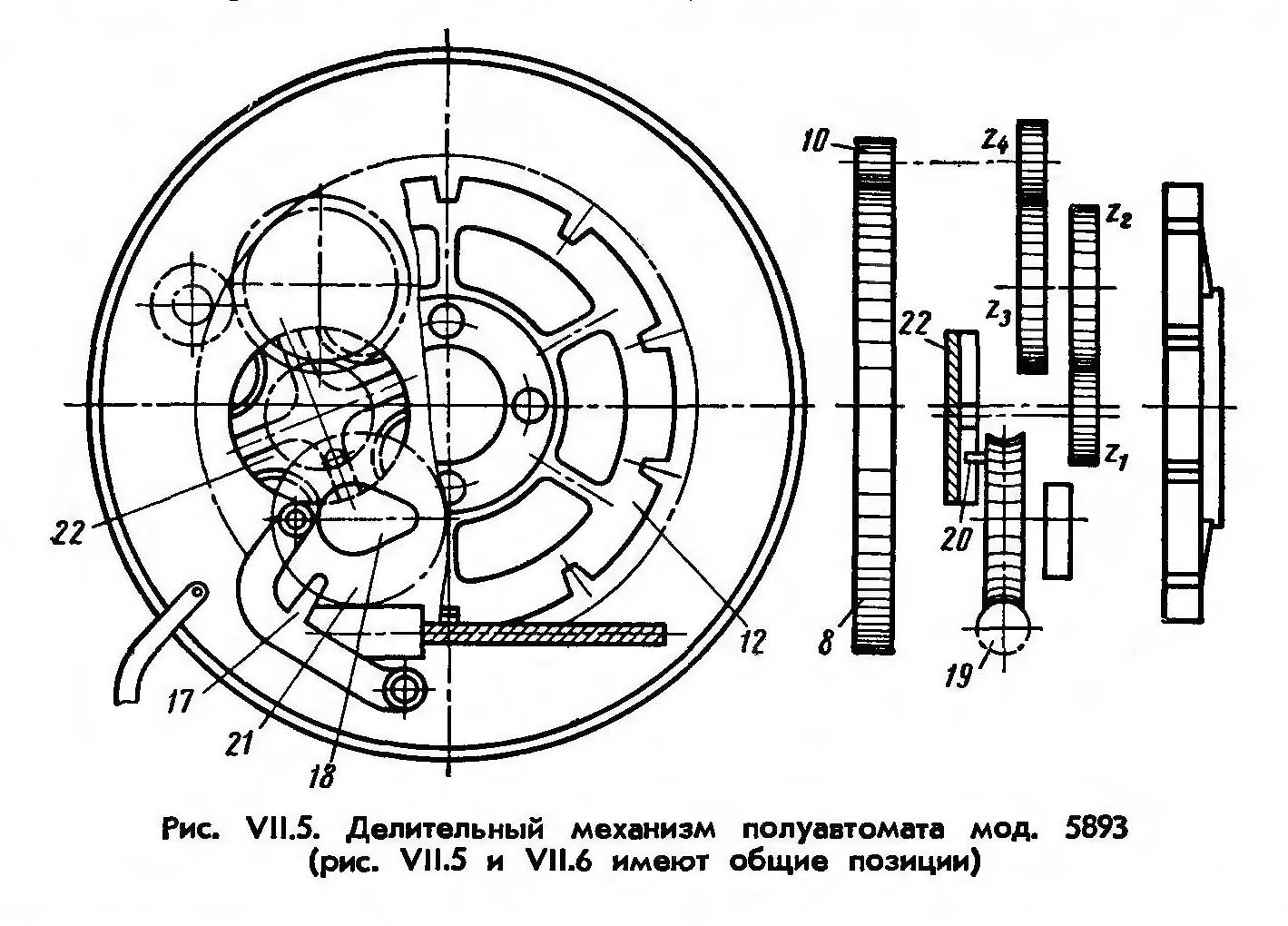 На одной оси з червячным колесом 21 (рис. VII.5) закреплен кулачок 18. В момент шлифования зуба долбяка зуб фиксатора 17 находится в пазу делительного диска 12, связывая всю систему в одно целое. После окончания шлифования зуба кулачок 18 отводит фиксатор 17, освобождая делительный диск. Ролик 20 (рис. VII.5 і 6), закрепленный на торце червячного колеса 21, входит в паз мальтийского креста 22, поворачивает его і через делительную гітару z1/z2 · z3/z4 і пару зубчатых колес 10—8 поворачивает шпиндель на заданный угол.