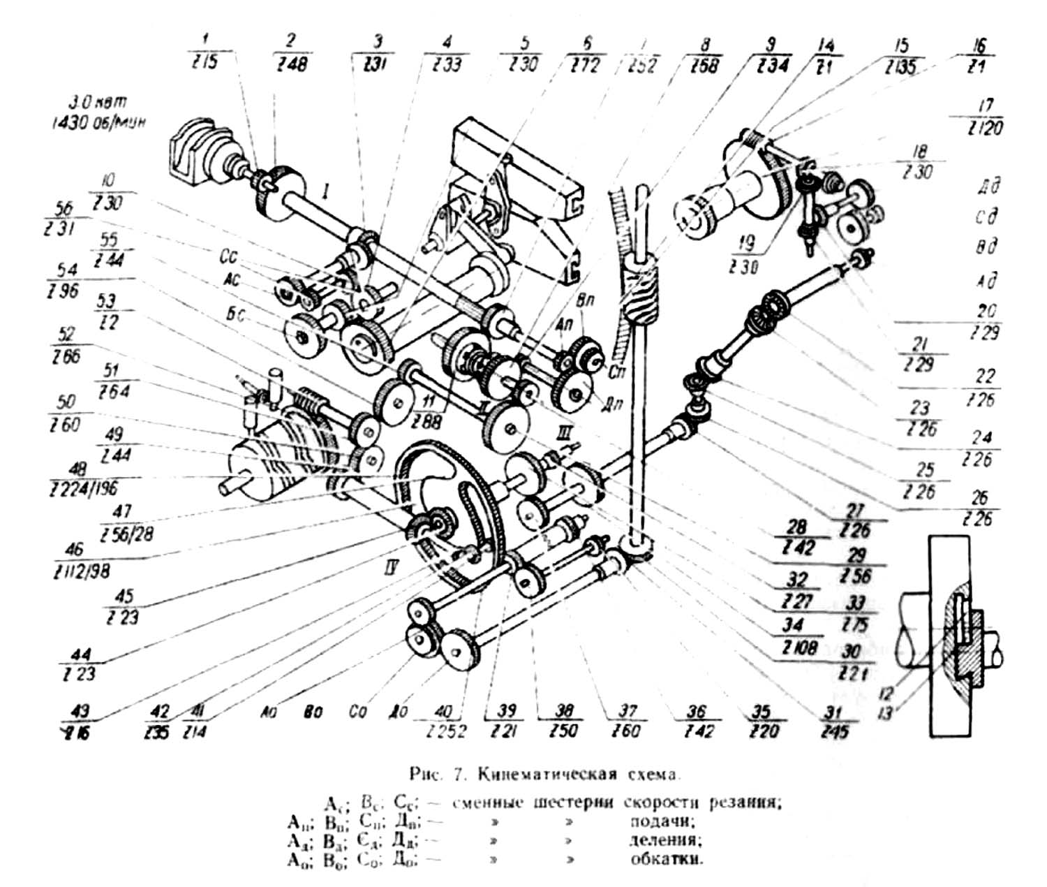 1. Кінематична схема зубострогального верстата 5А250П. Дивитись у збільшеному масштабі
