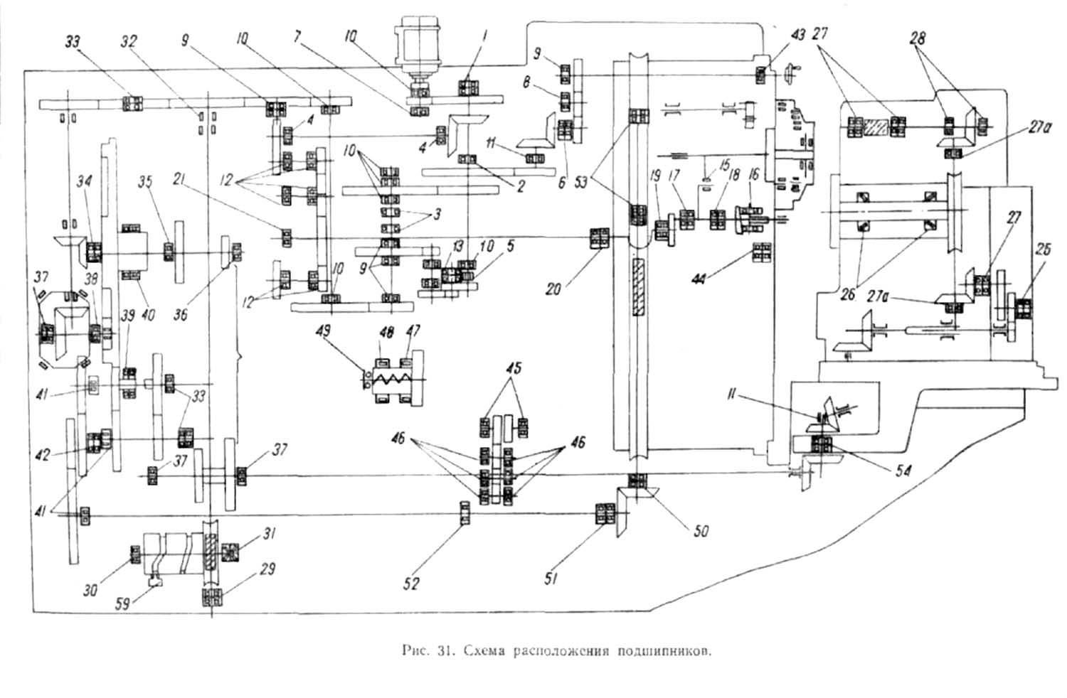 Схема розположення підшибників зубострогального верстата 5А250П. Дивитись у збільшеному масштабі