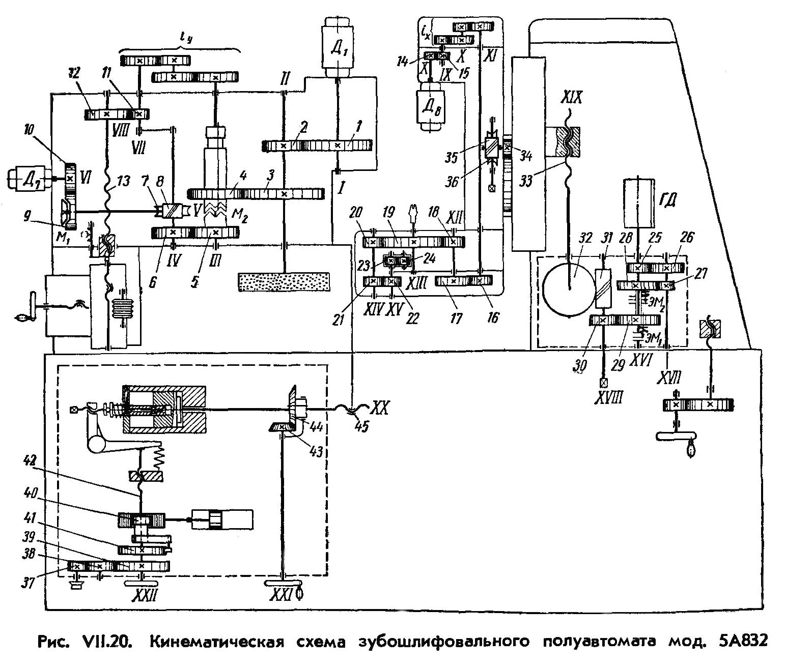 Кінематична схема (рис. VII.20)* напівавтомату имеет ланцюги: