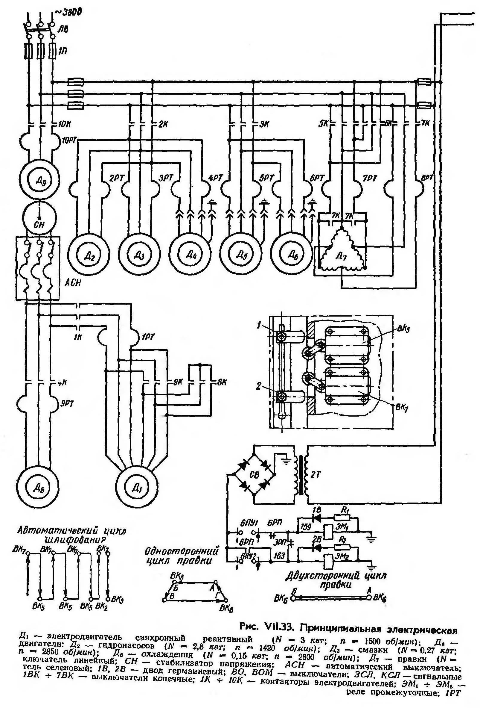 Електрична схема обеспечивает оба цикла роботи верстата при правке накатником — одностороннюю і двустороннюю правку (см. стр. 227). В зависимости от етого переключатель 5ПУ «Правка» устанавливается на соответствующую отметку.