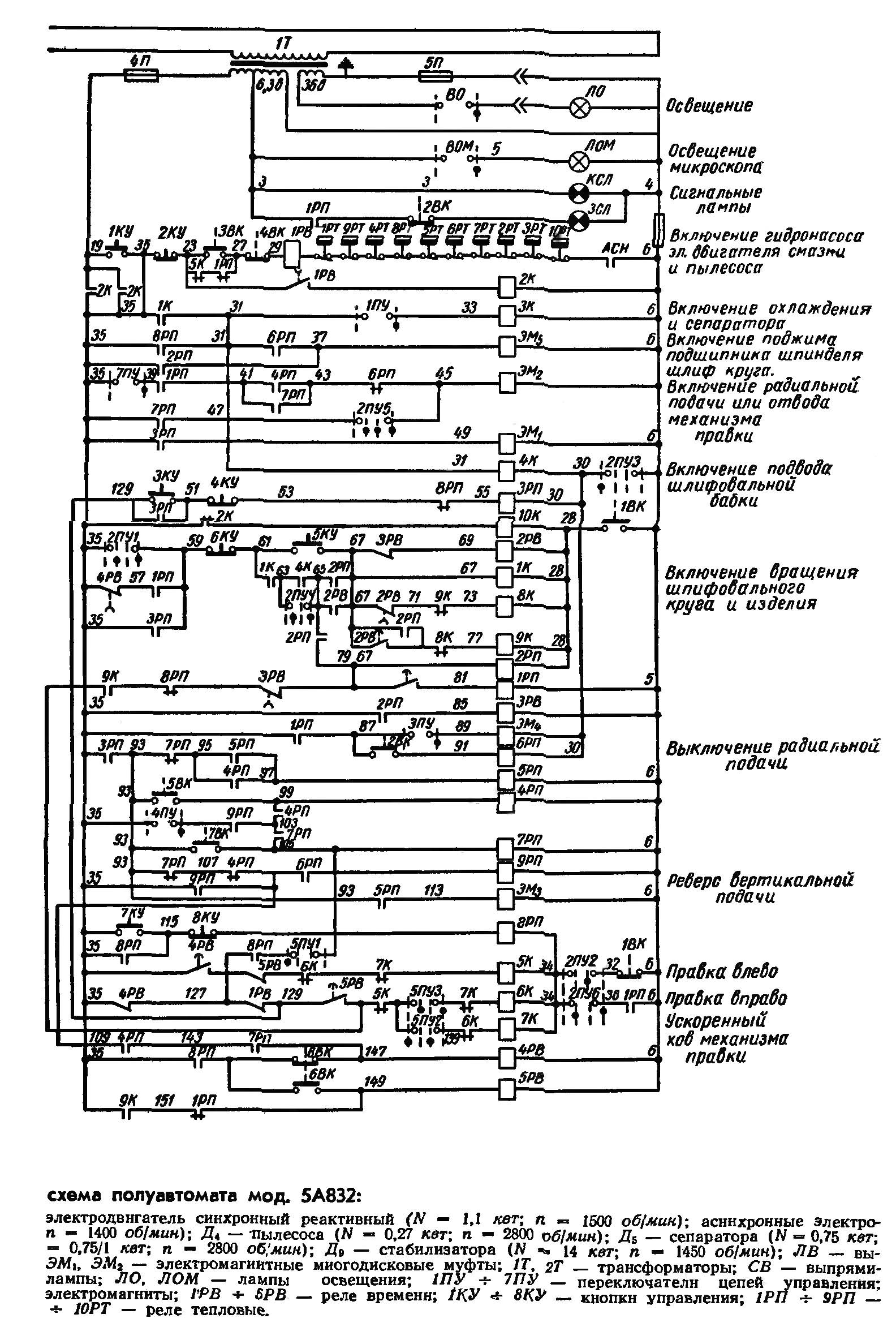 Автоматический цикл шлифования начинается включением гідроприводу вертикальной подачі суппорта вироби. Переключатель 7ПУ «Наладка суппорта» (рис. VII.33) должен быть выключен, а его контакт 7ПУ (35—39) закрыт. При выключенном електромагните ЭМ3 происходит вертикальная подача суппорта вниз до встречи упора 1 з конечным выключателем 5ВК. При етом н. о. контакт 5ВК (93—99) закрывается і включается промежуточное реле 4РП; н. о. контакты 4РП (41—43; 95—97; 99—103; 109—143) закрываются. Включается електромагнит ЭМ2 (рис. VII.32) і переключает золотник З2, в результате чего происходит радиальная подача (см, стр. 221). Н. о. контакты 5РП (95—97; 93—113) (рис. VII.33) закрываются і включают електромагнит ЭМ3 (рис. VII.32); золотник 33 перемещается і подводит масло под другой торец реверсивного золотника 36, осуществляя етим реверсирование гідродвигуна ГЦ, а следовательно, і вертикальной 'подачі суппорта вироби. Суппорт перемещается вверх.