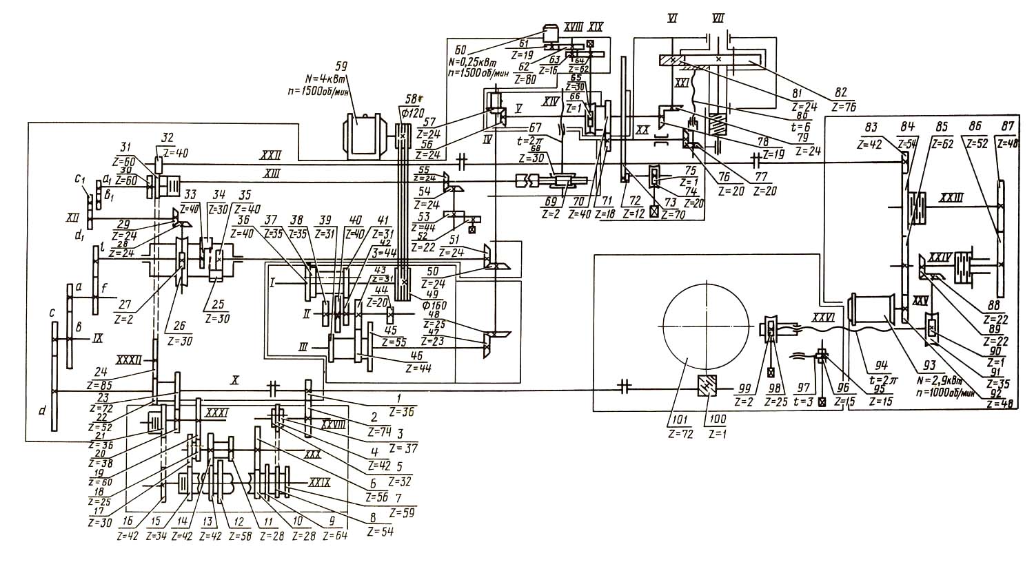 При нарезании зубьев обертання фрезы і заготовки должны быть согласованы между собой. Чтобы обеспечить ето условие, в станке имеется специальная ланцюг, принципова схема налаштування которой показана на рис. 2. Если колесо имеет z зубьев і совершит пк оборотів, а фреза за ето время сделает nф оборотів, то передаточное отношение ix между числом оборотів колеса і фрезы.