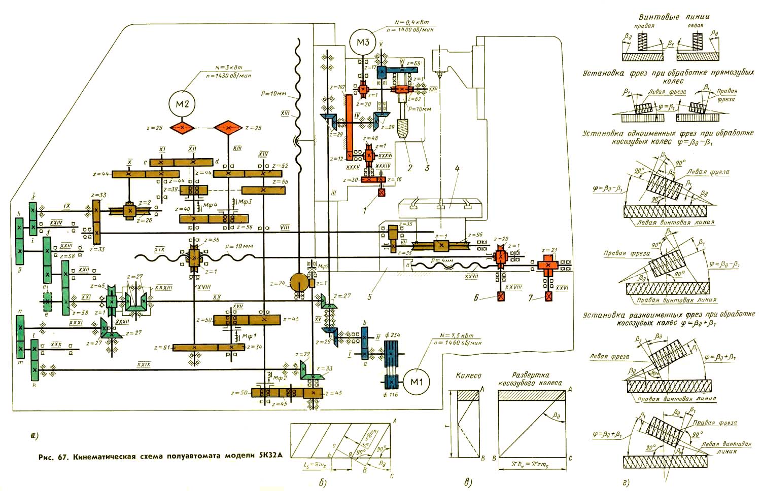 При обработке прямозубых колес в станке должны осуществляться наступні руху: главное движение, вертикальная подача суппорта, вращение стола і установочные переміщення суппорта. При автоматических циклах, кроме того, совершаются радиальная подача і установочные переміщення стола. При обработке косозубых колес необходимо еще дополнительное вращение стола для обробки зубьев, расположенных по винтовой линии.