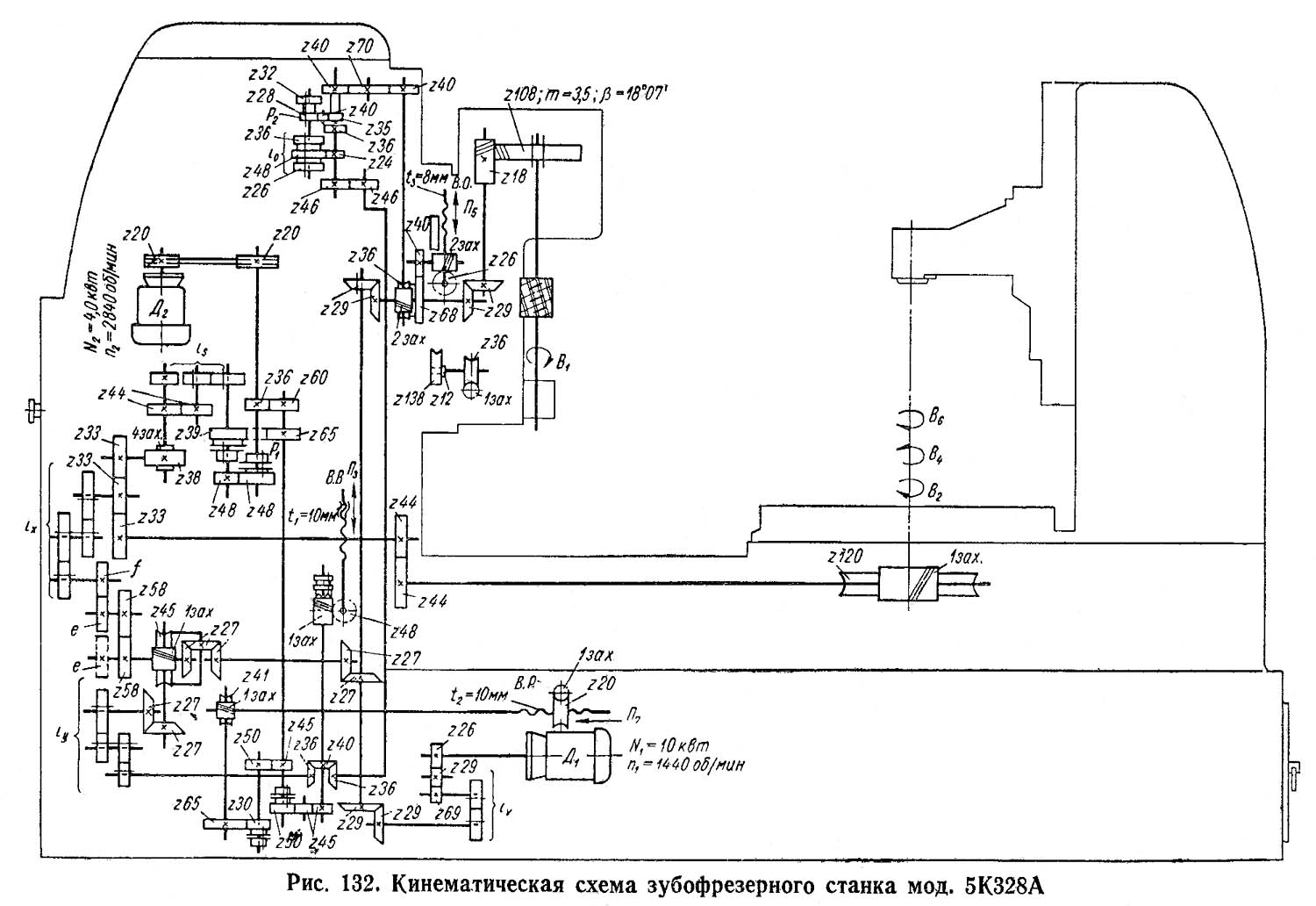 Кінематична схема зубофрезерного верстата 5К328а. Дивитись у збільшеному масштабі
