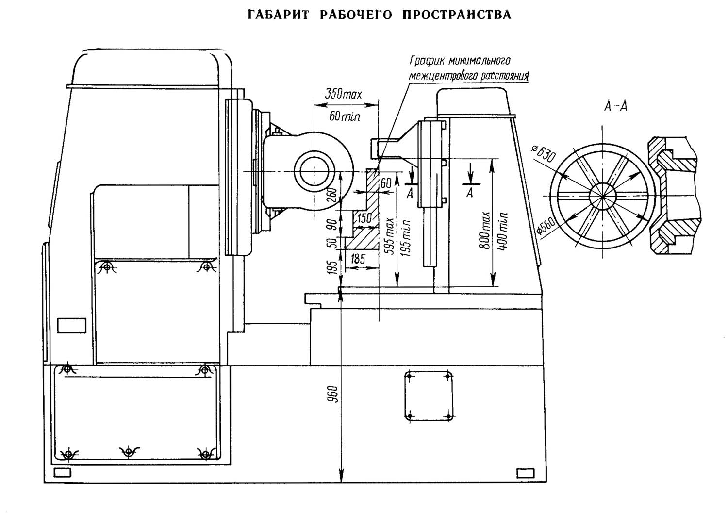 Габарит робочого простору зубофрезерного верстата напівавтомату 5м324а. Дивитись у збільшеному масштабі