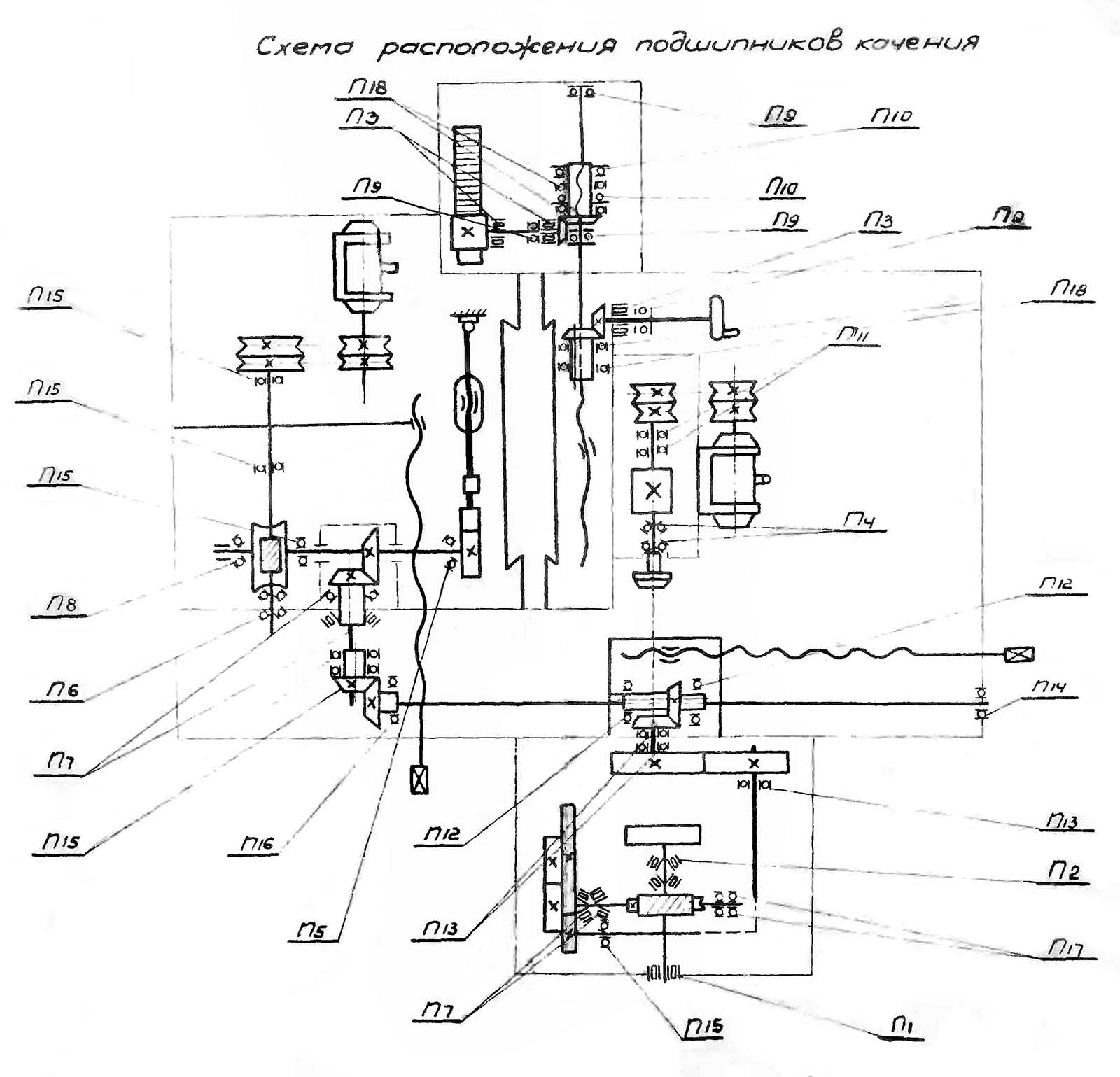 Схема розположення підшибників зубозакругляющего верстата 5М580. Дивитись у збільшеному масштабі