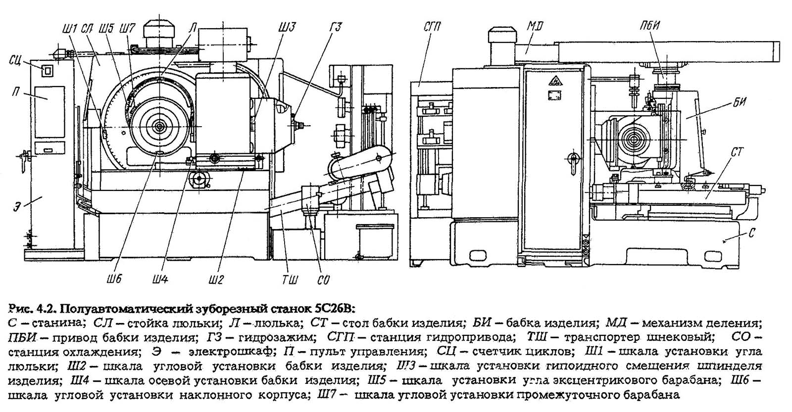Розташування складових частин зубострогального верстата 5С26В