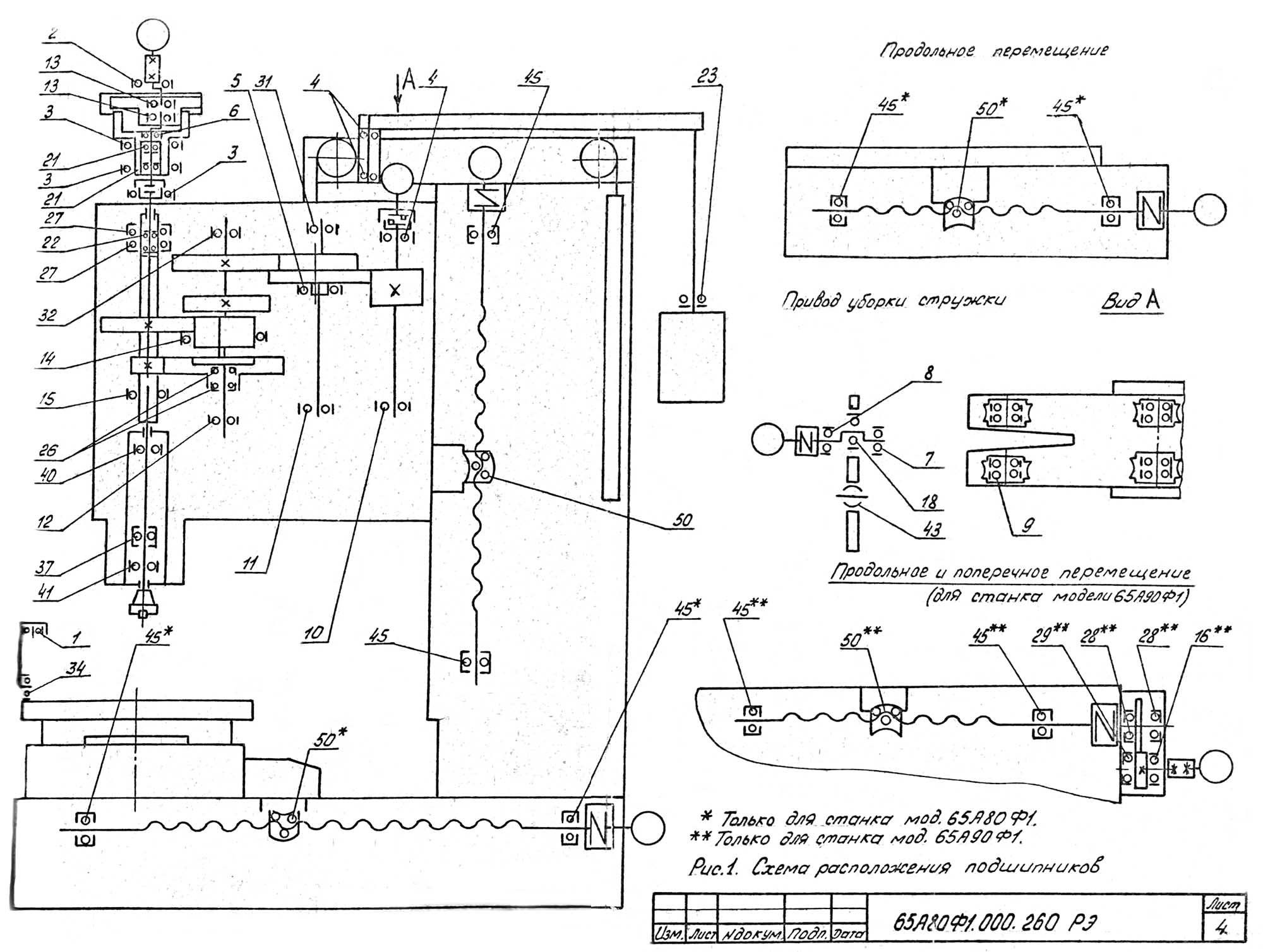 Схема розположення підшибників бесконсольного фрезерного верстата 65А80Ф1. Дивитись у збільшеному масштабі