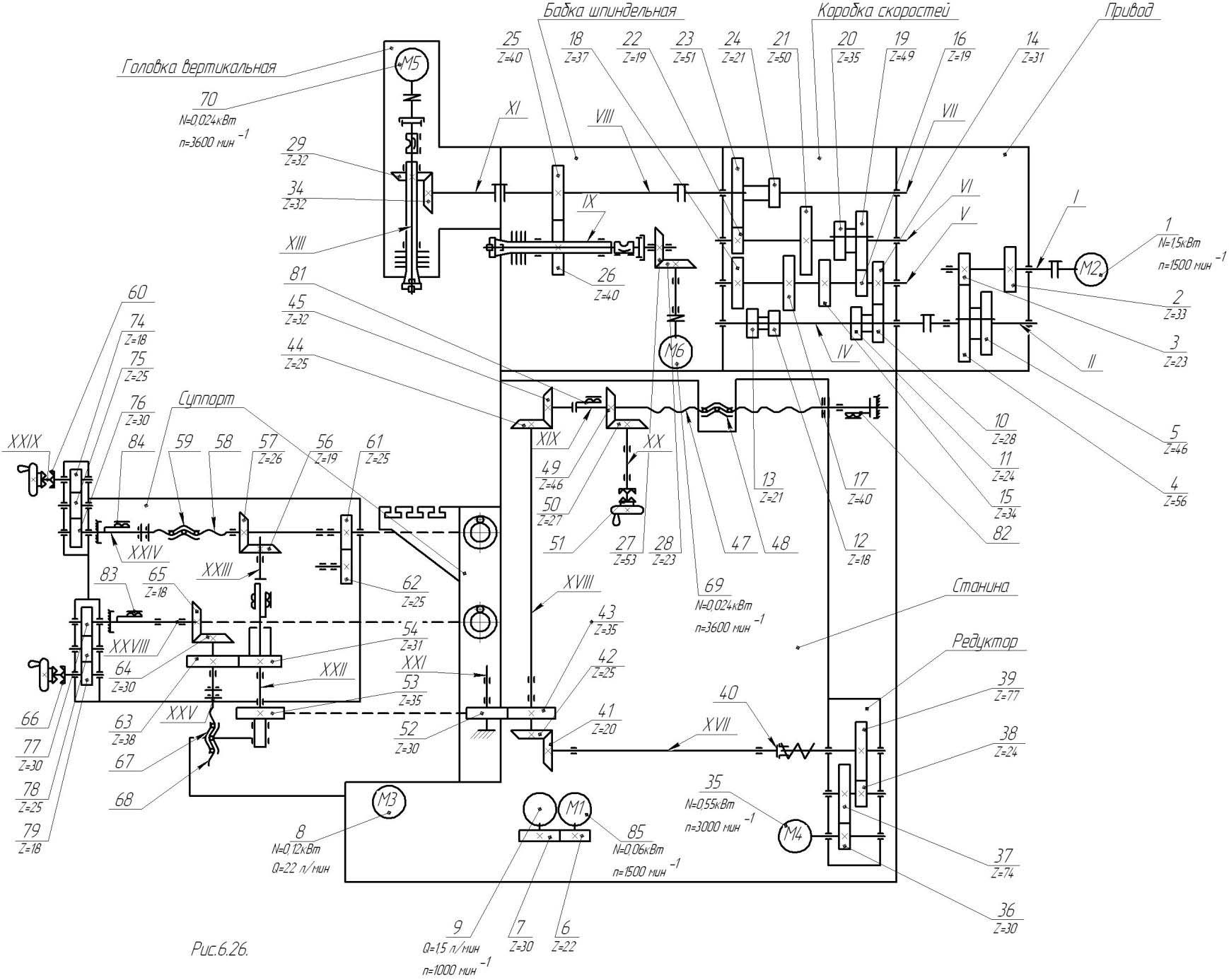 В главном приводе имеется восемнадцатиступенчатая коробка швидкостей, причем на верхних двенадцати ступенях в передаче участвуют лишь две пары зубчатых колес, а на шести нижних ступенях — три пары.