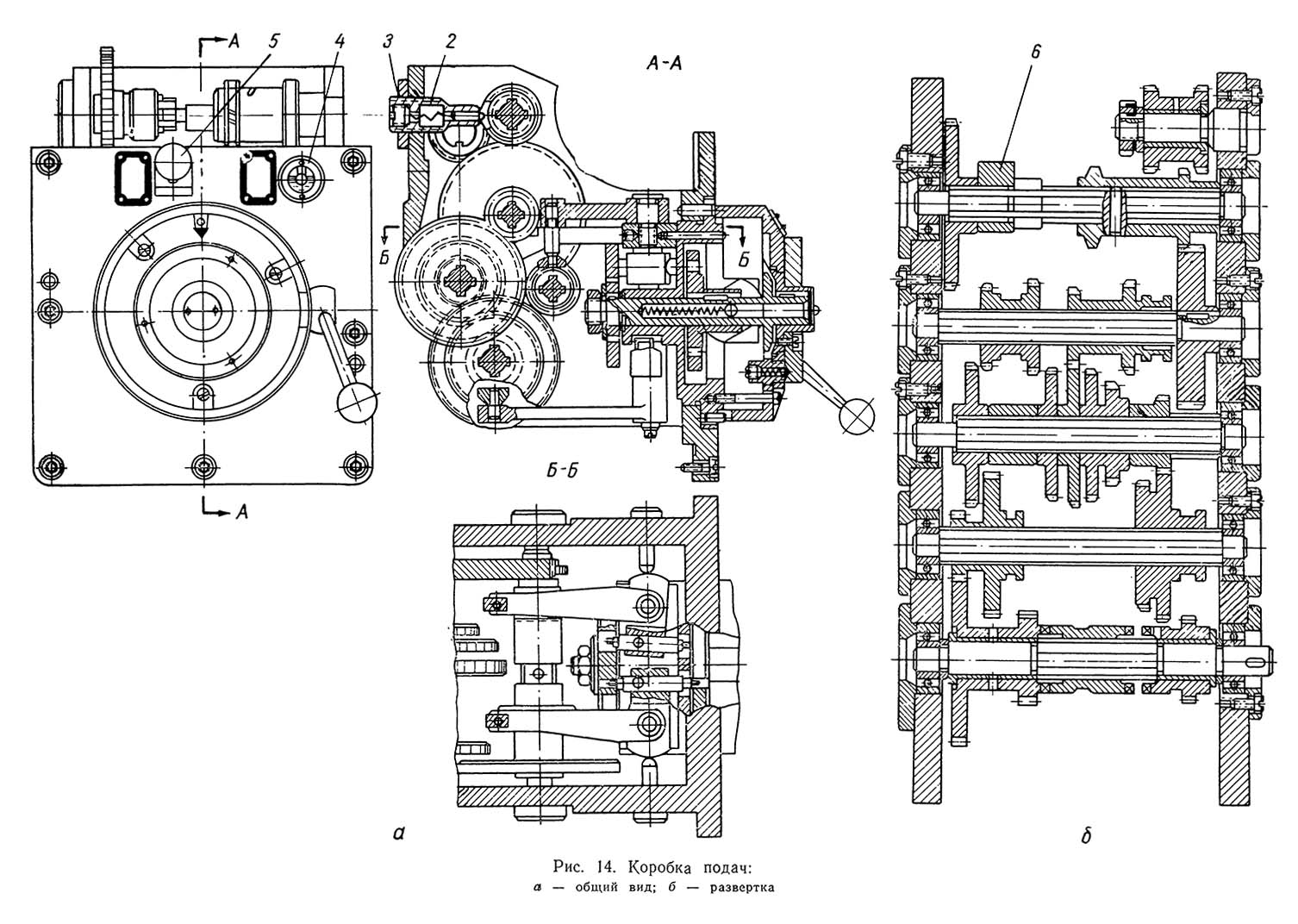 Коробка подач (рис. 14) сообщает суппорту і шпиндельной бабке 16 различных подач, а также быстрое перемещение. Керування коробкой подач такое же, как і коробкой швидкостей. При переключении подач следите за тем, чтобы крестовая рукоятка суппорта находилась в нейтральном положении.