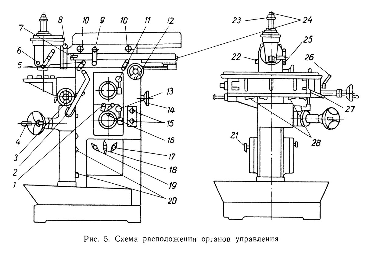 Розташування органів керування фрезерным верстатом 676. Дивитись у збільшеному масштабі