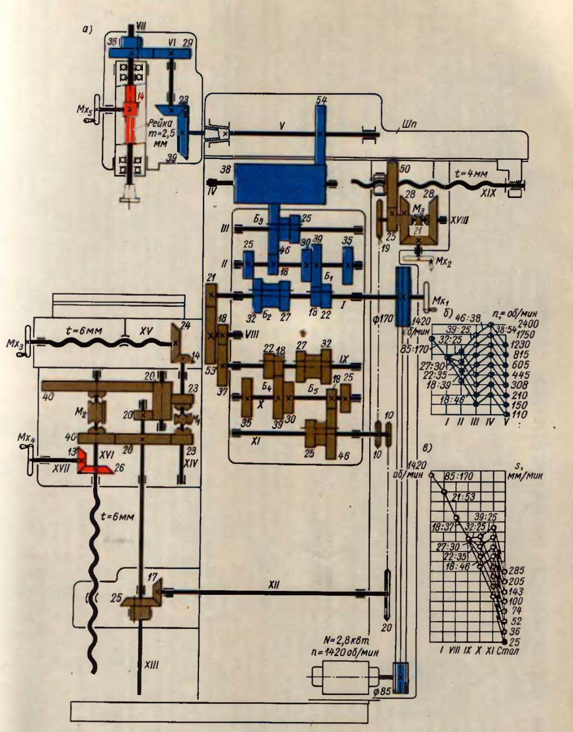 От електродвигуна, мощностью 2,8 кВт, рух передається на вал 1 клинноременной передачей. От вала I через шестерни коробки швидкостей, сидящих на валах II і III, зубчатое колесо 56, сидящее на валу IV, через зубчатое колесо 47 передається вращение горизонтальному шпинделю V.