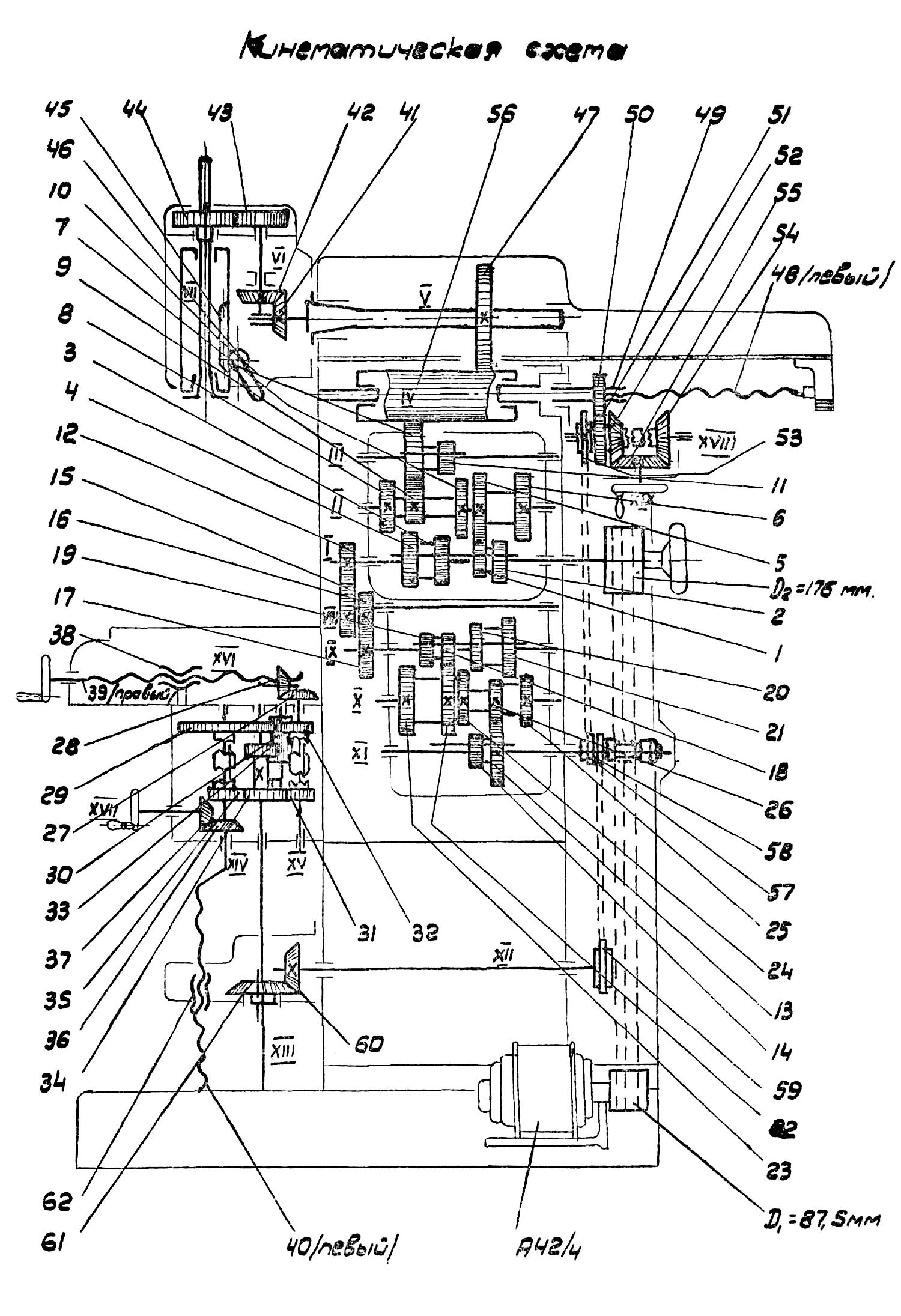 От вала XI через цепную передачу 58; 59 вращение передається валу XII, конической паре 60; 61, вертикальному валу XIII.